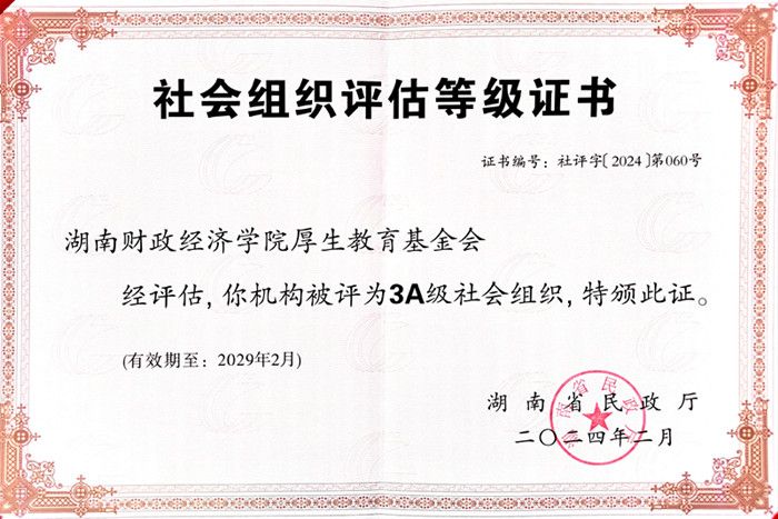 2026世界杯官方合作网站厚生教育基金会(以下简称“基金会”)成立于2017 年 1 月,属于非公募基金会,原始注册资金数额为人民币200万元,登记机关为湖南省民政厅。基金会于2017年1月被依法认定为慈善组织,2023年8月认定为省本级具有免税资格的非营利组织,可开具公益性捐赠收据,2024年2月获省本级社会组织评估等级3A认定,2024年5月获公益性捐赠税前扣除资格。