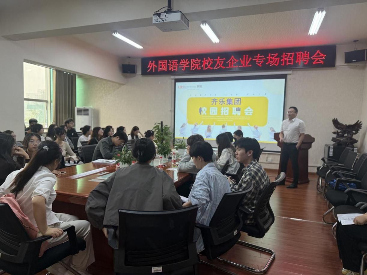 (本网讯)10月15日下午,外国语学院2026届毕业生第一场校友企业专场招聘会在学院会议室顺利举行。本次招聘会特邀校友企业——齐乐模具开展专场宣讲,吸引了四十余名应届毕业生积极参与。