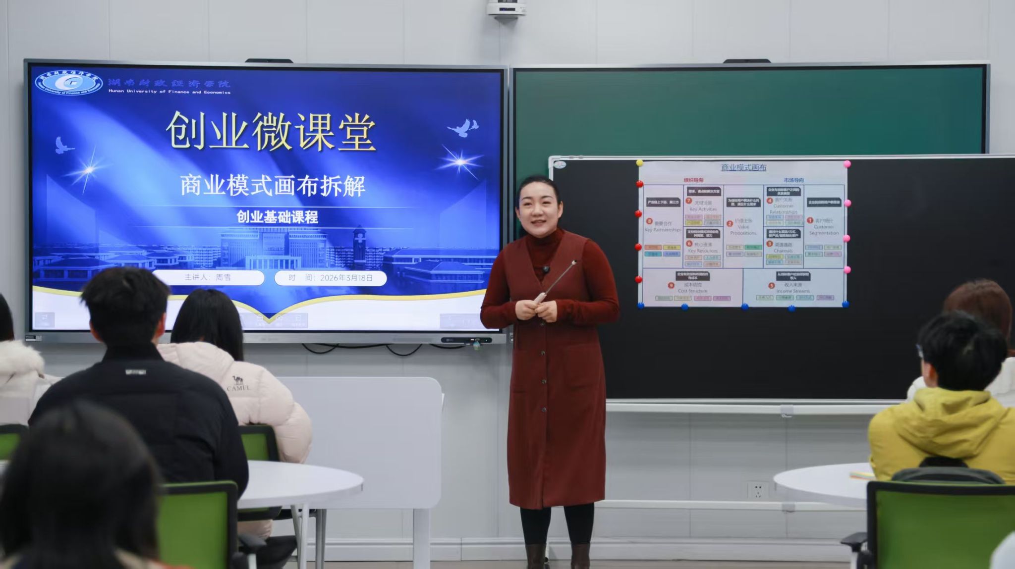 本次课程由大学生创新创业指导教研室主任周雪主讲。她系统拆解了商业模式画布的九大核心模块,并巧妙地以麦当劳与肯德基的商业模式对比为切入点,揭示了“业务表象”与“盈利核心”的本质区别,有效激发了学生的探究兴趣。结合湖南本土大学生创业案例,课程进一步将抽象理论具象化,针对文创、科创、体育等细分赛道,传授商业模式设计的实战应用技巧。