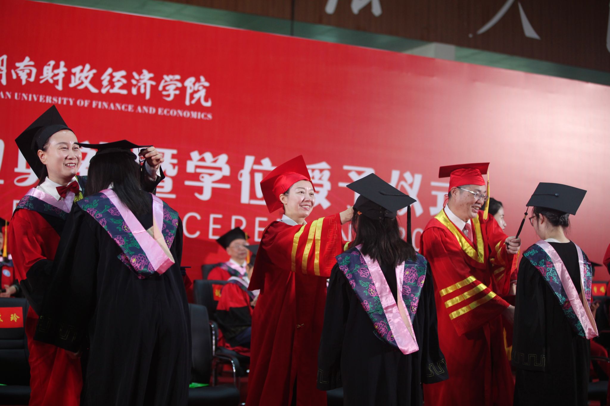 在学位授予仪式上,毕业生们依次走上主席台,全体校领导、相关学院负责人和教授代表为他们一一正冠拨穗、颁发证书,与他们亲切交谈,合影留念。