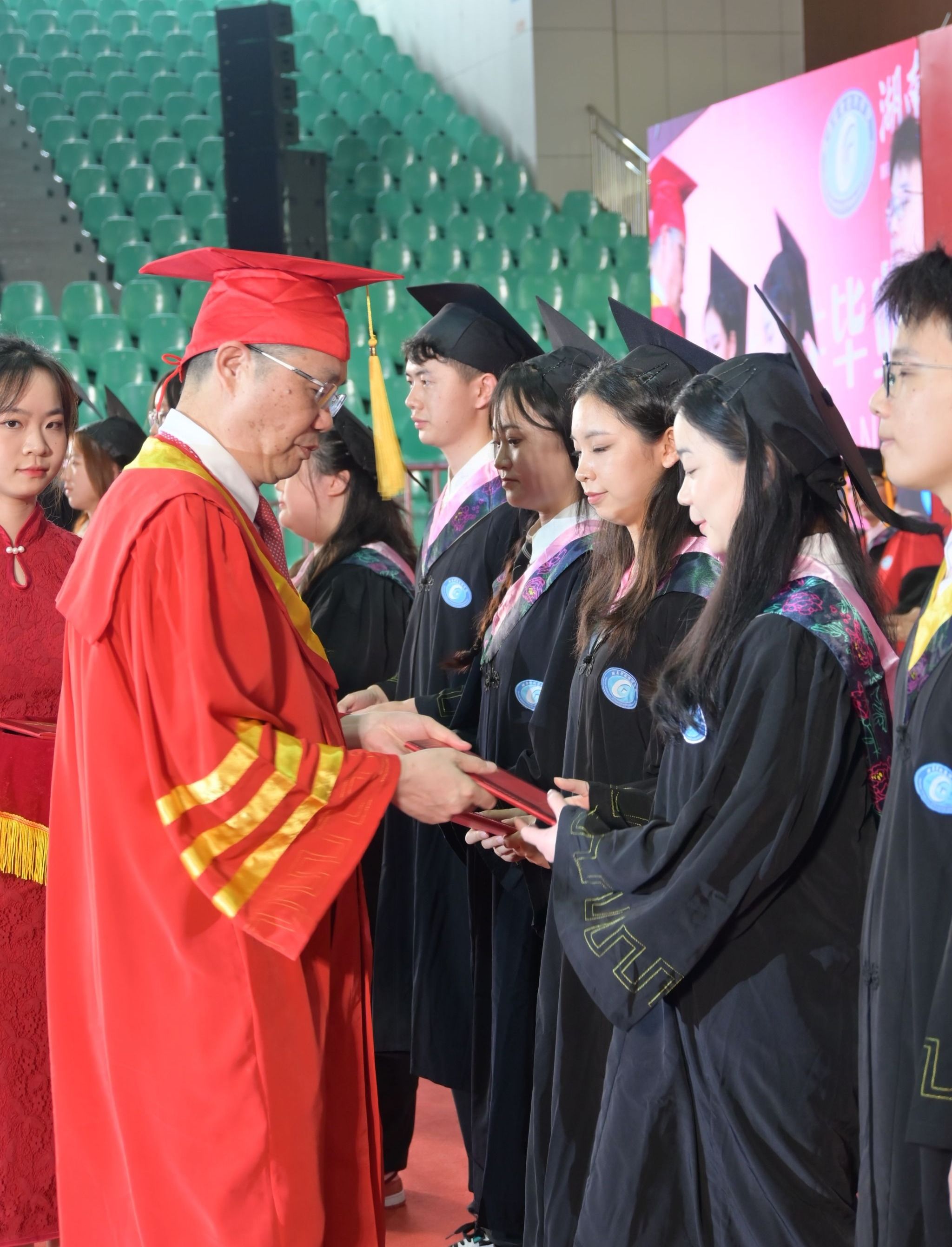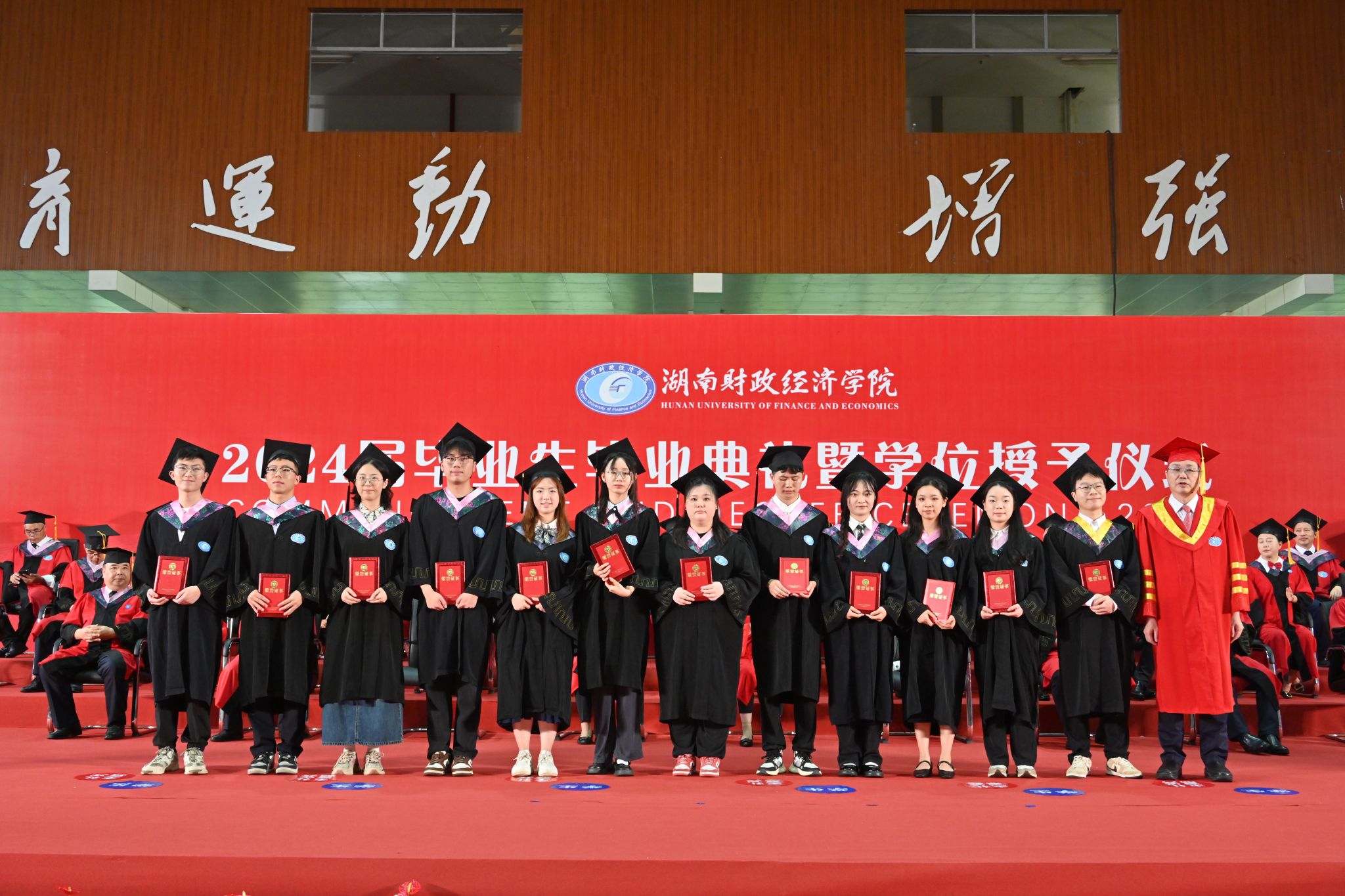 副校长郭国强宣读关于准予2024届毕业生毕业暨学士学位授予决定的相关文件,校党委副书记苏玲宣读《湖南省教育厅关于表彰湖南省普通高等学校2024届优秀毕业生和创新创业优秀毕业生的通报》,校长刘长庚为优秀毕业生代表颁发荣誉证书。