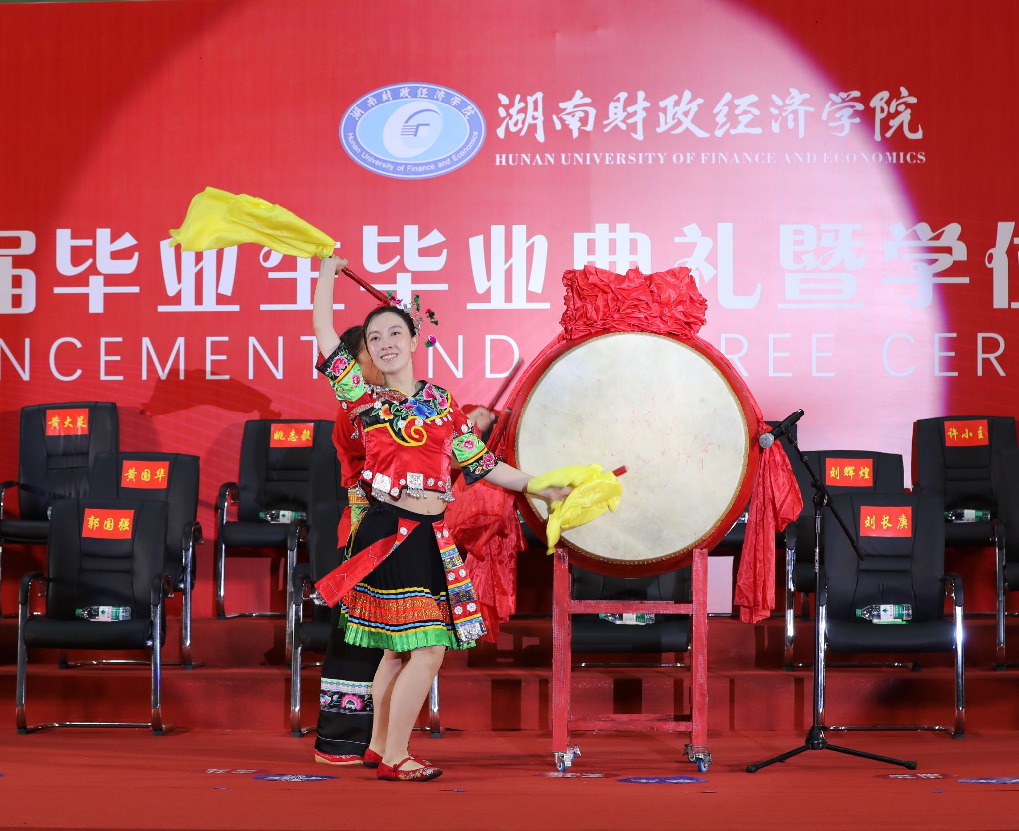 典礼开始前,现场大屏幕上滚动播放着毕业主题视频,2021届毕业生易格格再回母校表演苗鼓《鼓舞青春》,鼓声阵阵,师生共叙离别意、共话师生情、共呈祝福心。