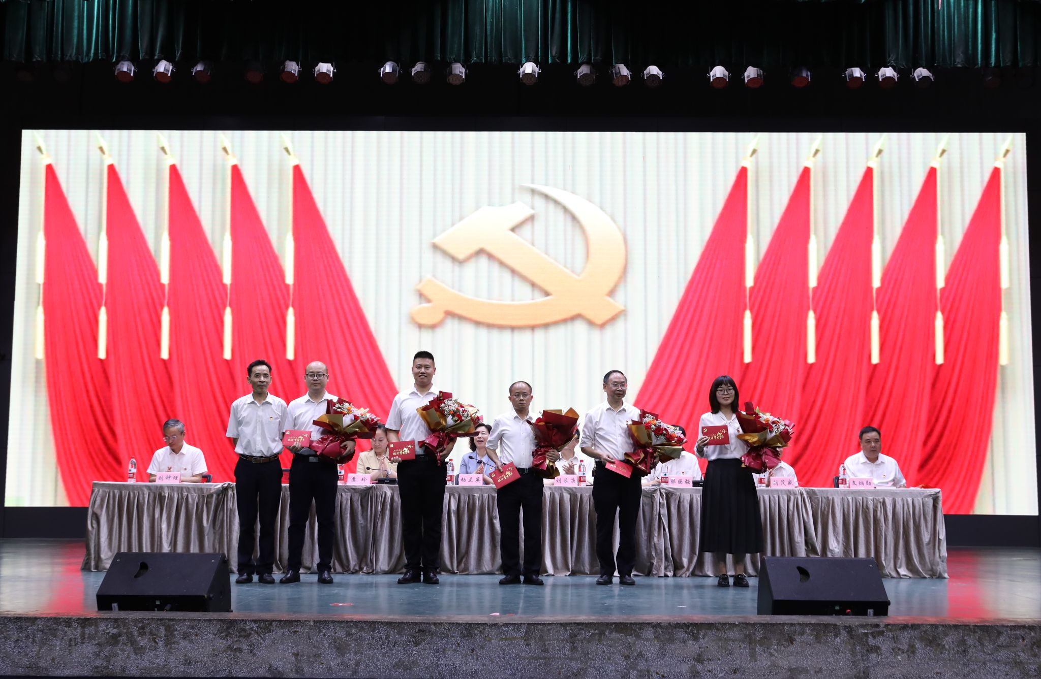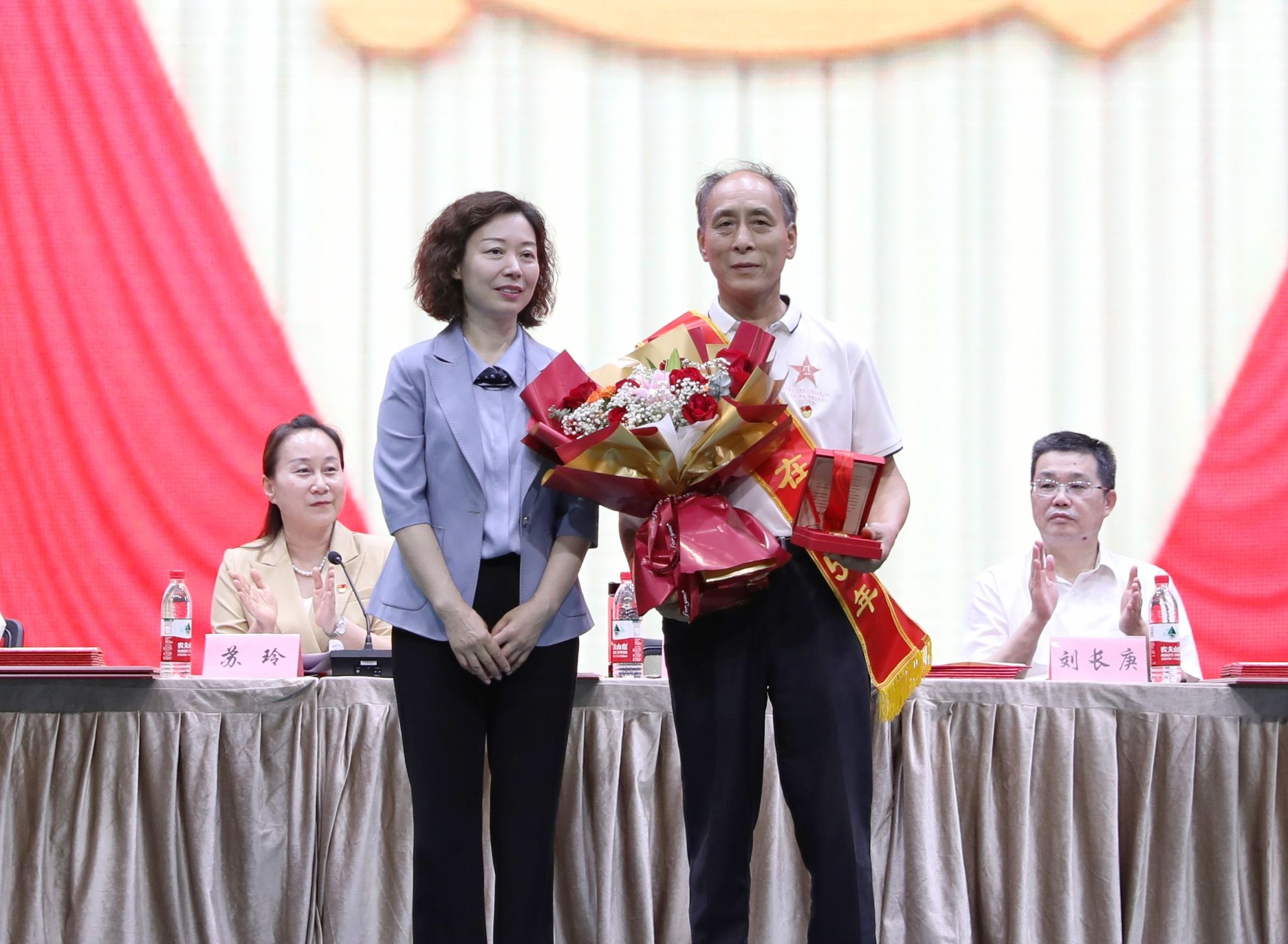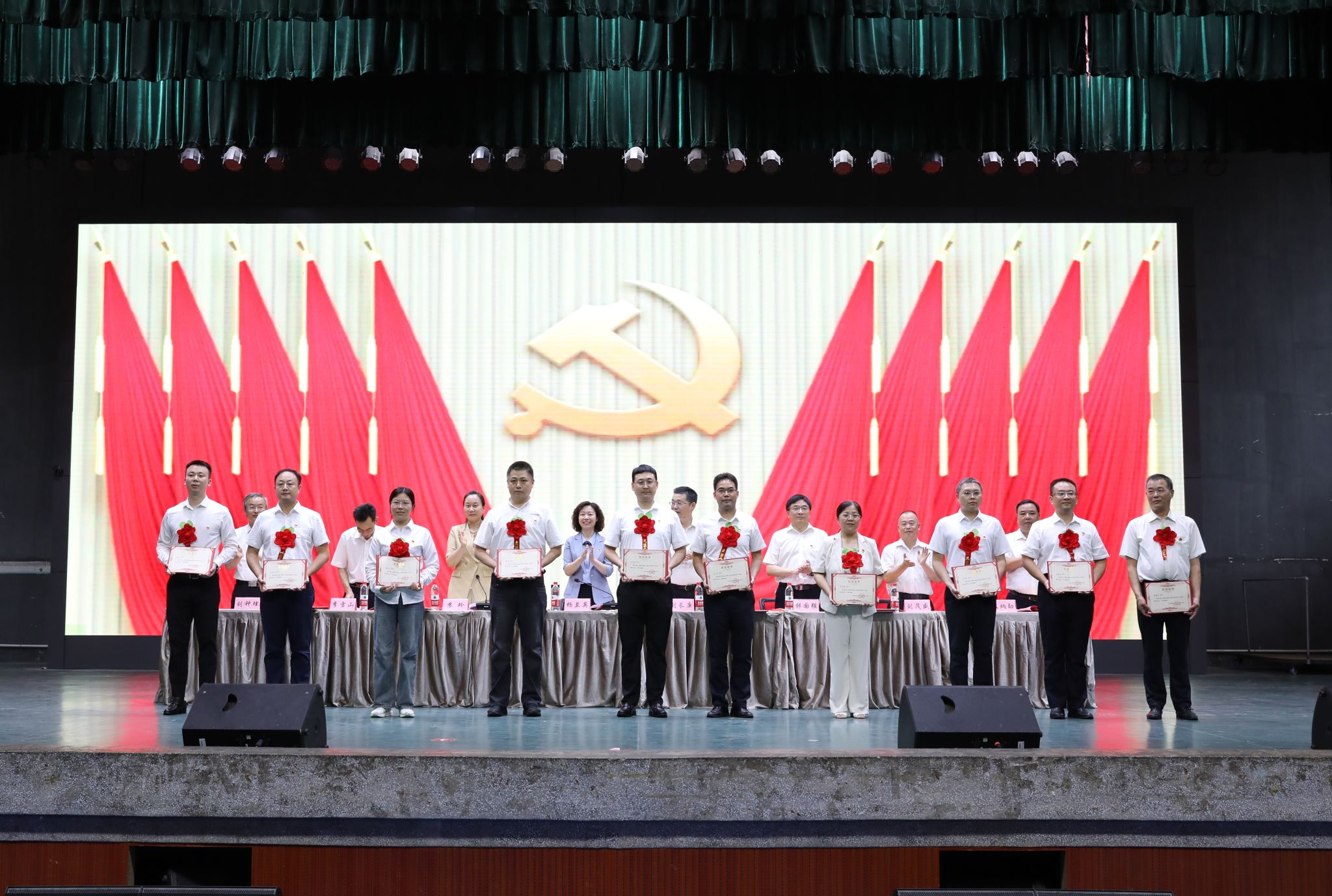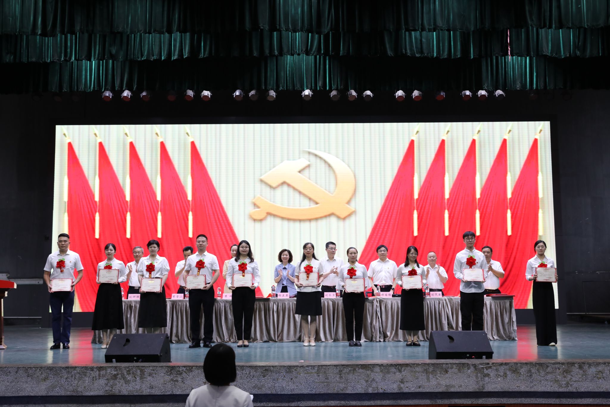 下午3时,表彰大会开始,全体起立,奏唱国歌。在校党委副书记苏玲带领下,全体党员面向党旗,高举右手,庄严宣读了入党誓词。副校长郭国强宣读了《关于表彰2023-2024年度优秀共产党员、优秀党务工作者和先进基层党组织的决定》,学校领导为“光荣在党50年”老党员代表颁发纪念章,为39名优秀共产党员、10名优秀党务工作者和10个先进基层党组织代表颁发奖牌和荣誉证书。会上,学校特意为7月1日入党的党员同志,集体举办“政治生日”仪式,校纪委书记李雪山为他们赠送了“政治生日”贺卡。