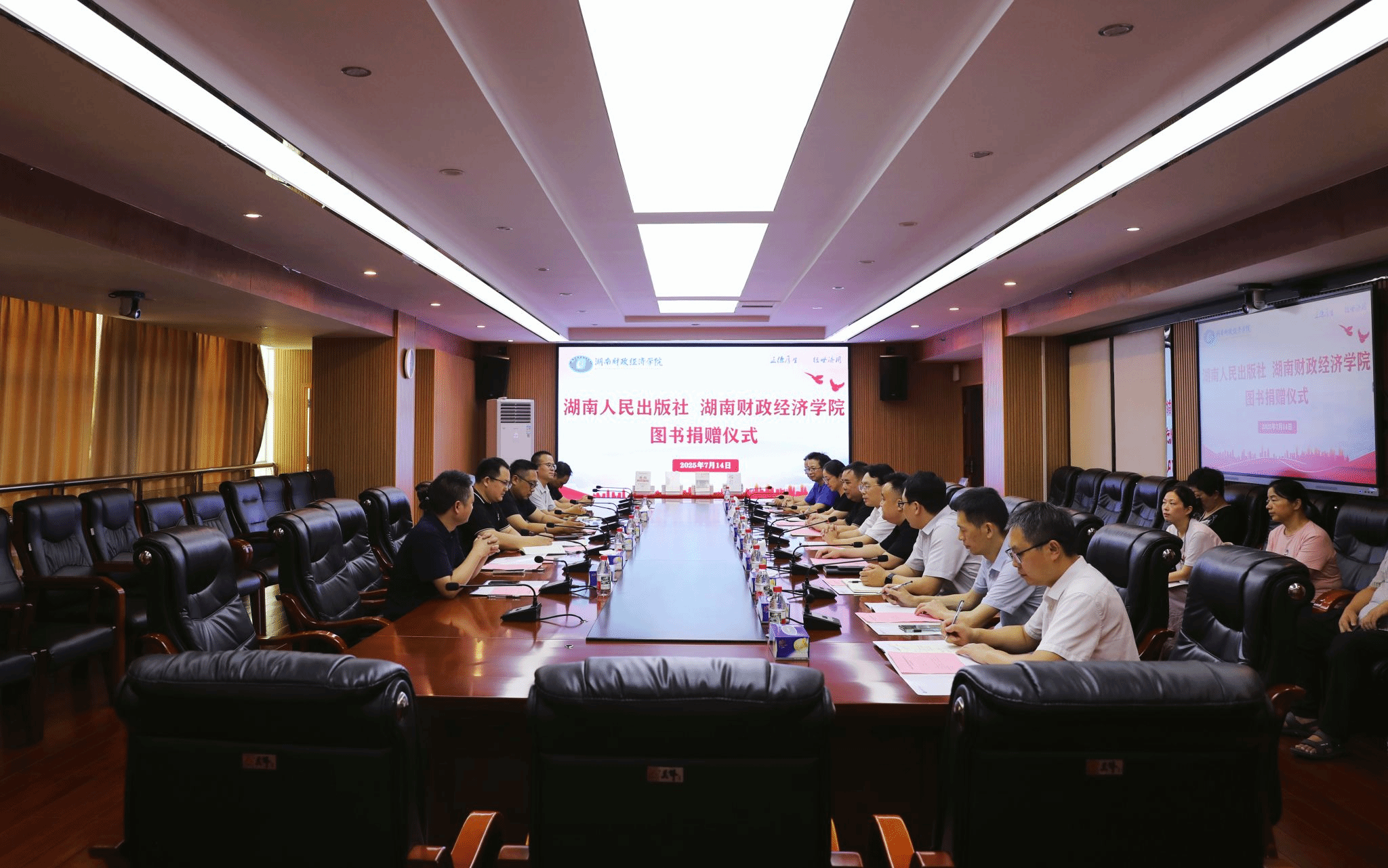(本网讯)7月14日下午,湖南人民出版社捐赠图书仪式在世界杯官网办公楼715会议室举行。湖南人民出版社党委书记、社长张勤繁,副社长彭翔,校党委书记易棉阳,副校长潘爱民,党委委员、宣传部、统战部部长文炳勋出席捐赠仪式。