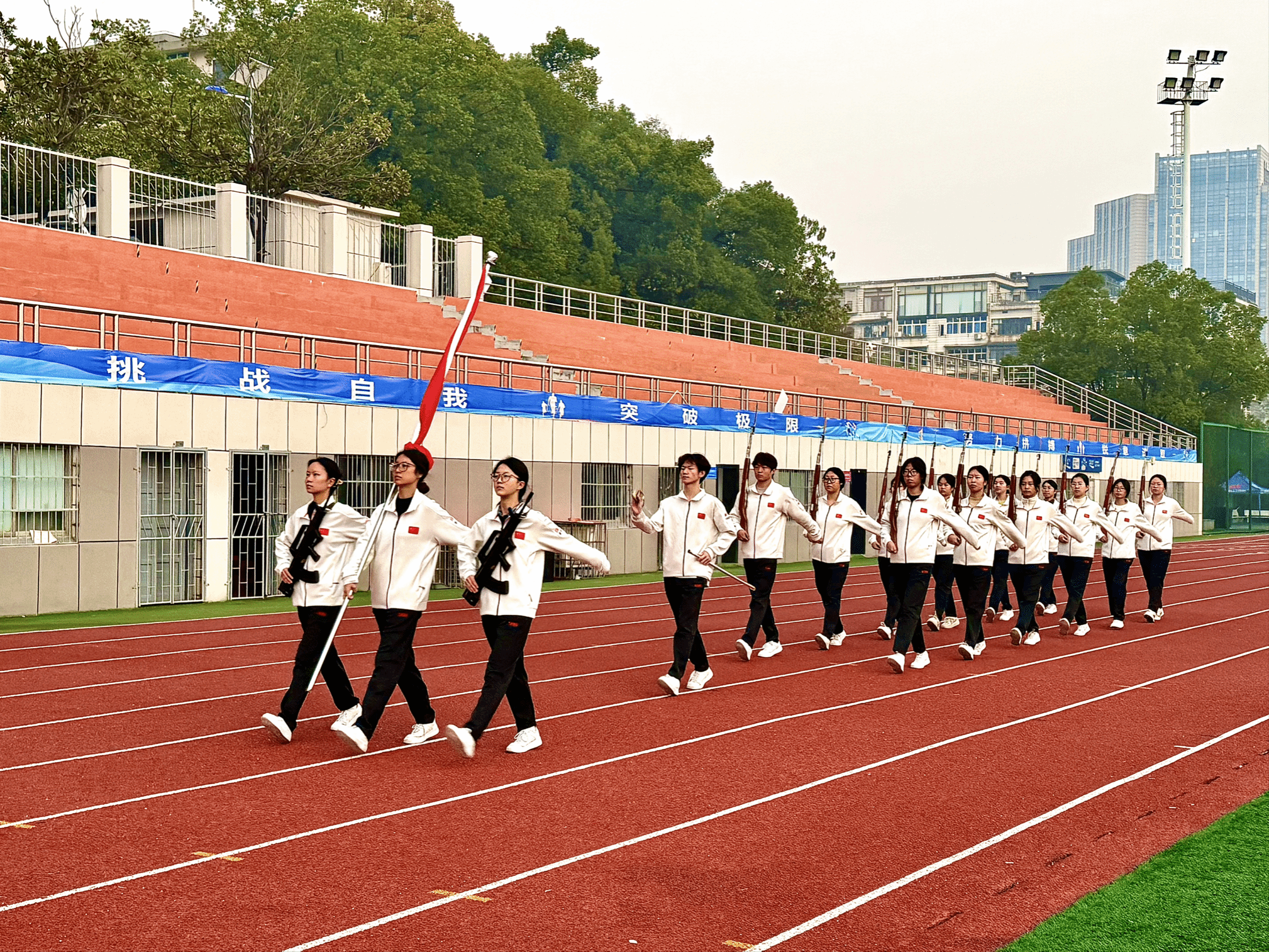 上午7时整,升旗仪式正式拉开帷幕。英姿飒爽的国旗护卫队队员们迈着整齐划一、铿锵有力的步伐,昂首挺胸护卫着鲜艳的五星红旗走向升旗台。他们目光如炬、精神抖擞,每一步都彰显着昂扬向上的精神风貌。