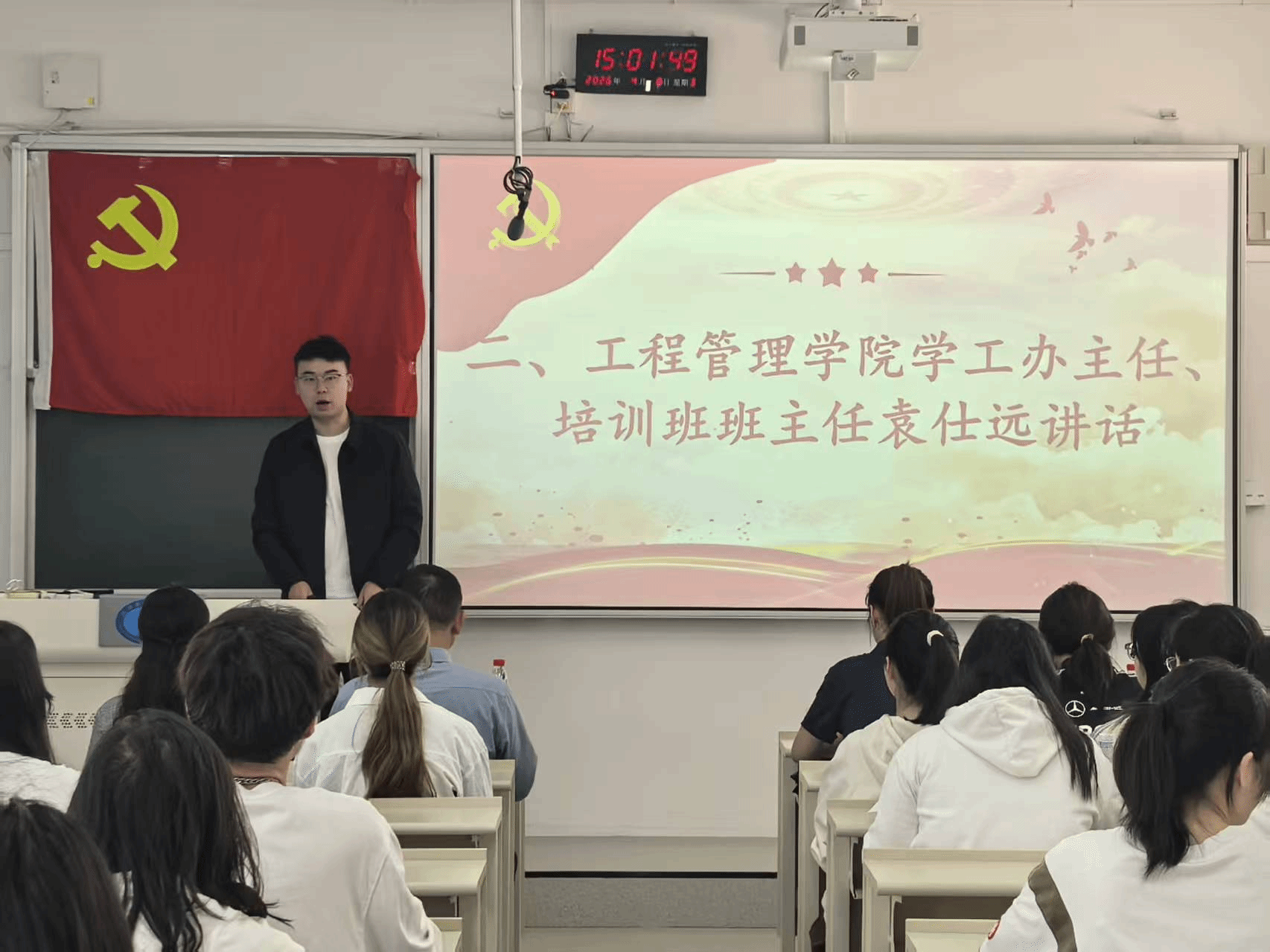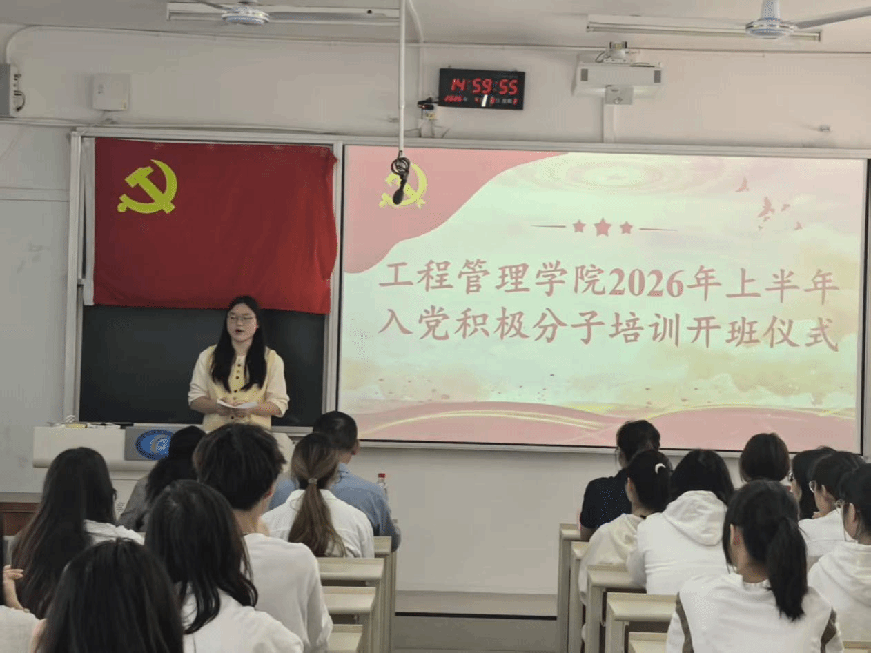 (本网讯)为深入学习贯彻习近平新时代中国特色社会主义思想,严格落实党员发展工作要求,切实加强入党积极分子思想理论教育与党性修养,严把党员发展“入口关”,2026年4月8日,工程管理学院2026年上半年入党积极分子培训班开班仪式在第二教学楼2217教室隆重举行。学院党委书记、党委副书记、分党校负责人、各学生党支部书记、团组织负责人及全体参训学员出席仪式,仪式由颜筱蝶同学主持。