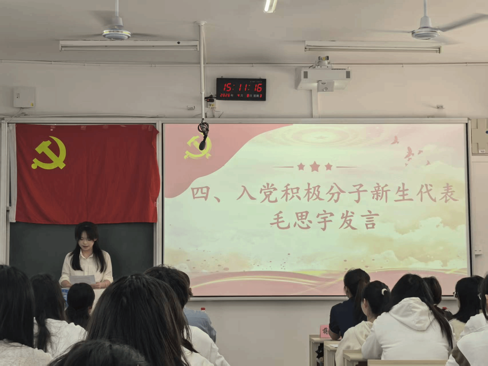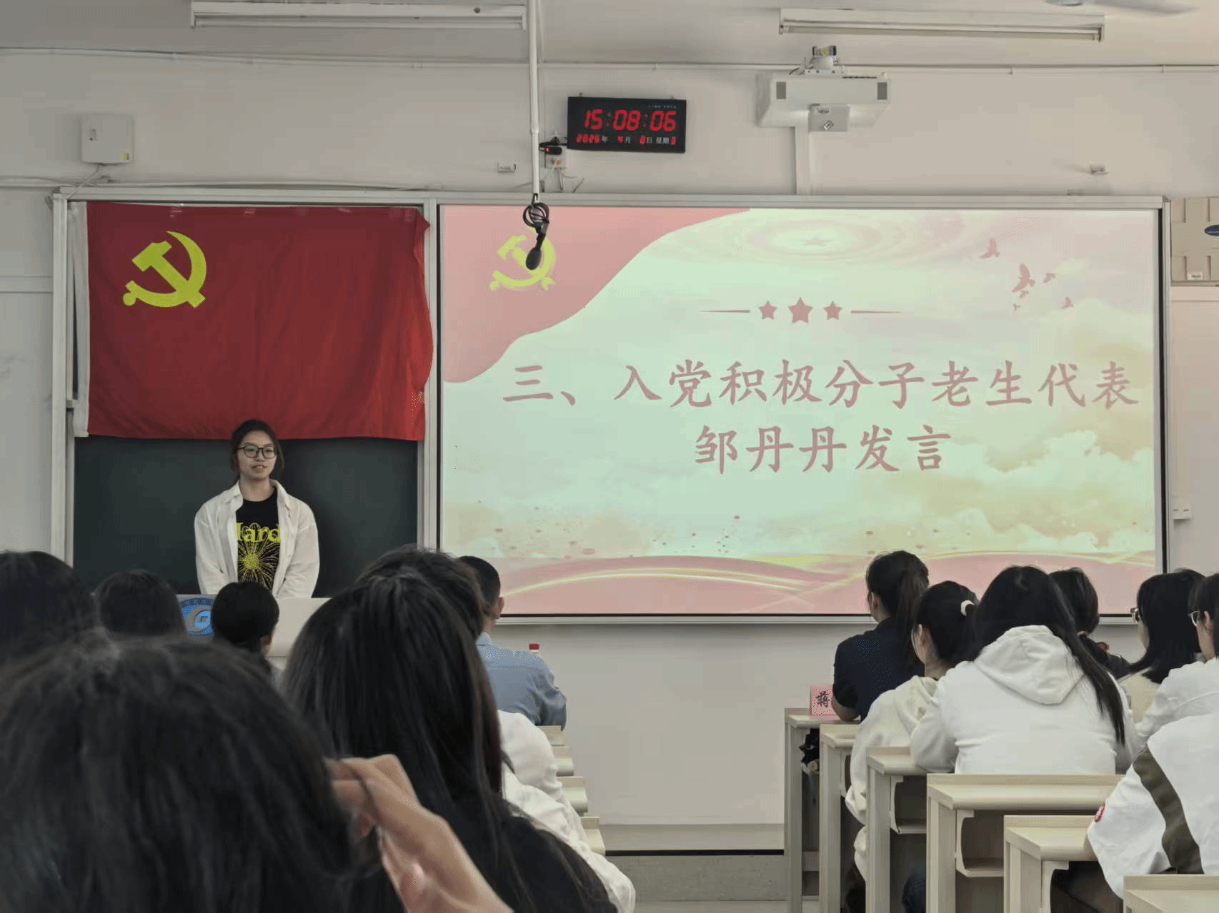 上一期学员代表邹丹丹结合自身培训经历,分享理论学习与实践成长感悟,勉励新学员珍惜机会、铸牢根基、严于律己。本期学员代表毛思宇代表全体学员郑重承诺:将认真学习党的创新理论、党章党规与党史知识,端正入党动机、坚定理想信念,以实际行动争取早日入党。