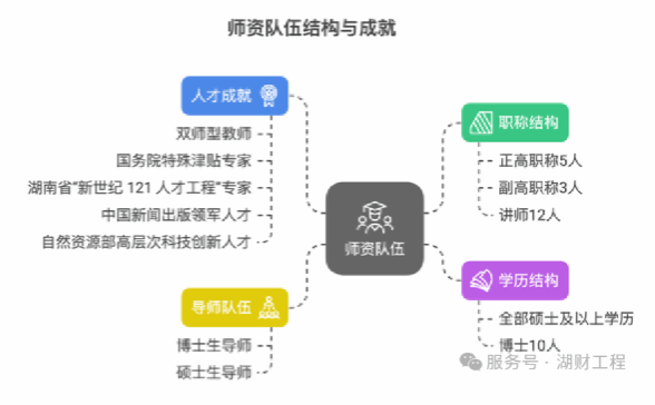本专业拥有一支经验丰富、结构合理的师资队伍,现有专任教师20人,其中正高职称5人,副高职称3人,讲师12人,高职称教师占40%;硕士及以上学历教师20人,占100%;博士10人,占50%。其中博士生导师1人,硕士生导师5人,双师型教师6人,国务院特殊津贴专家1人,湖南省“新世纪 121 人才工程”专家1 人,中国新闻出版领军人才1人,自然资源部高层次科技创新人才1人。