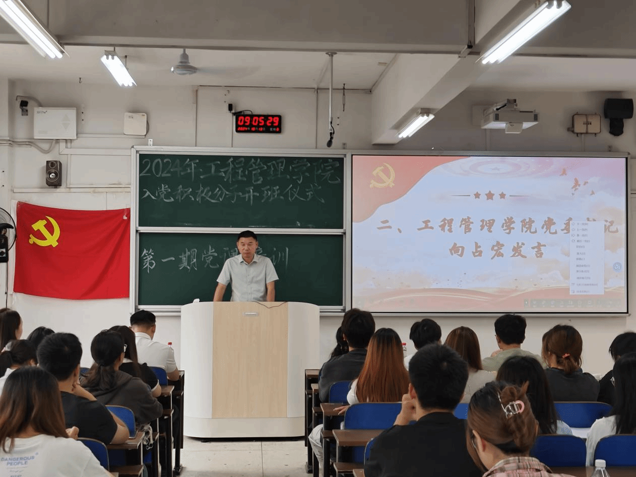 10月13日下午,工程管理学院分党校于三教3202教室隆重举行了2024年下半年入党积极分子培训班开班仪式,并开展了第一次党课教育培训。参加培训教育的领导有工程管理学院党委书记向占宏、党委副书记刘绿丝、学工办主任袁仕远,还有学生支部书记蒋慧佳、胡晓峰、徐湘婷以及培训班全体学员。