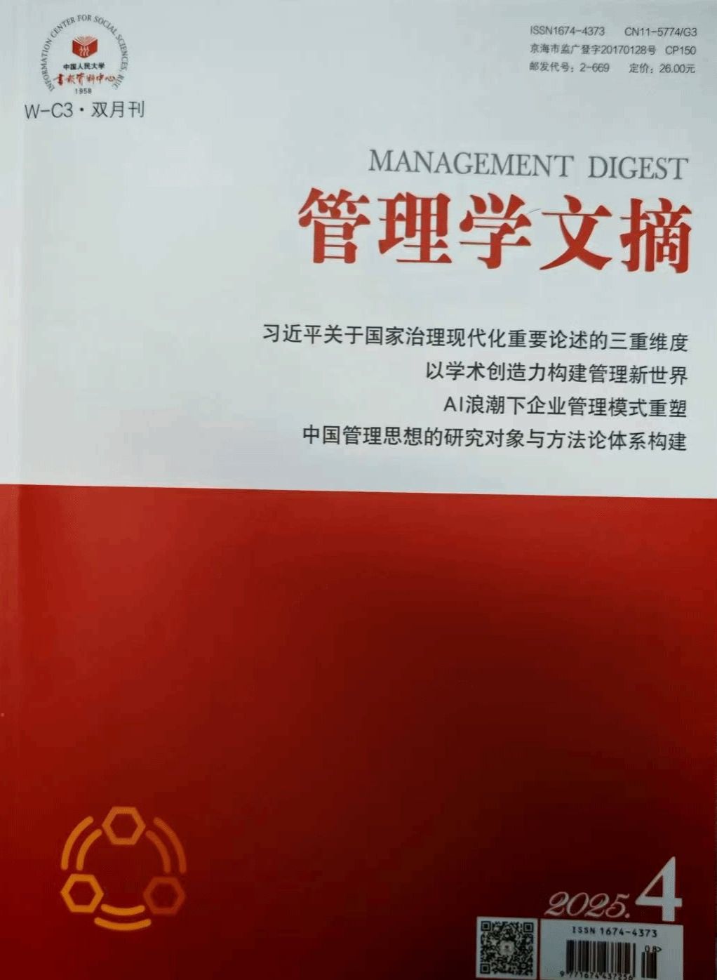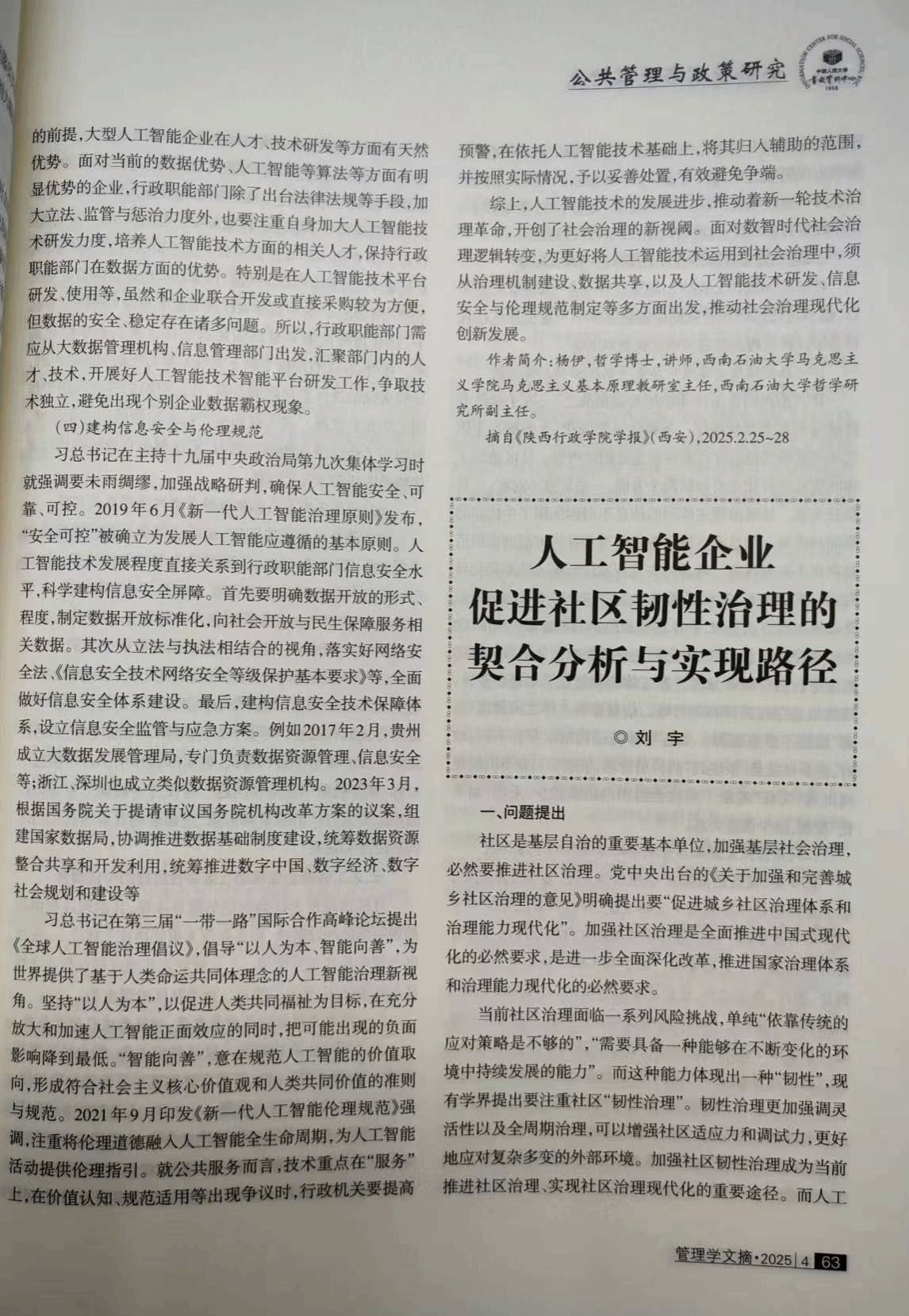 (本网讯)近日,我院教师刘宇副教授撰写的学术论文《人工智能企业促进社区韧性治理的契合分析与实现路径》被中国人民大学书报资料中心《管理学文摘》2025年第4期转载。《人大复印报刊资料》由中国人民大学书报资料中心出版发行,是中国人文社科领域最具影响力和核心竞争力的学术品牌,被誉为“中华学术的窗口”“中外文化交流的桥梁”,是中国人文社会科学领域公认的国家级权威性刊物,是人文社科领域对“高质量研究”的官方认可,其转载行为是对论文学术价值与研究质量的高度认可。