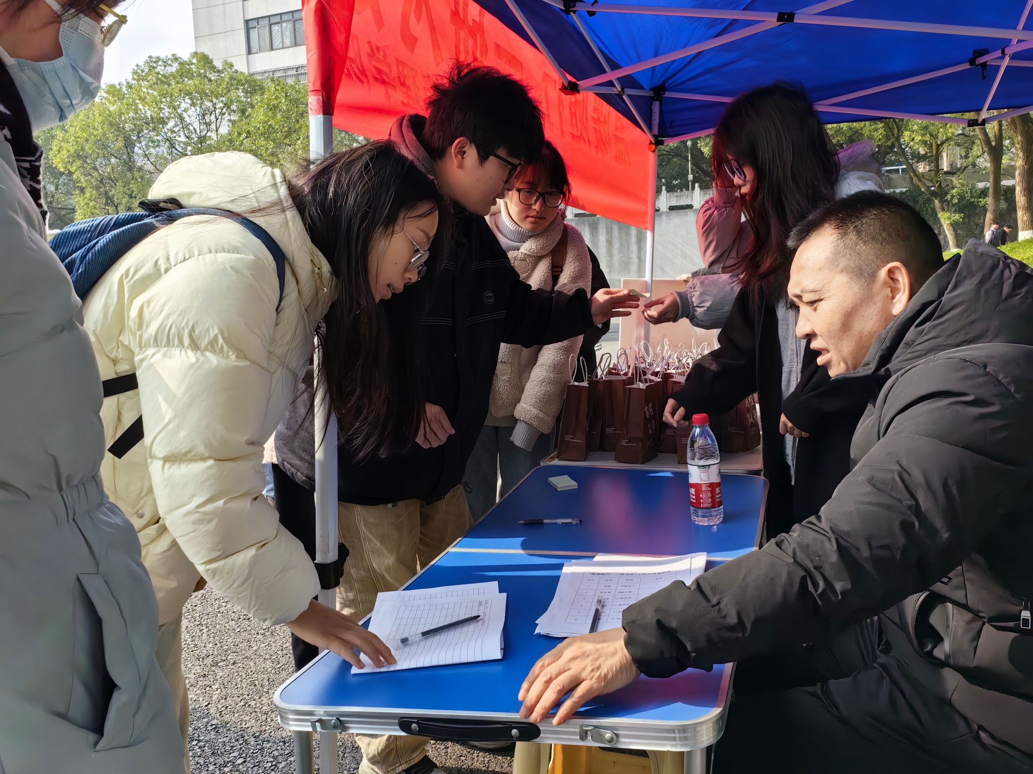 (本网讯)12月21日,为帮助我院考研学子提振考试信心,缓解备考压力,鼓舞考研士气,营造和谐、温暖、友爱的学院氛围,法学与公共管理学院在大礼堂侧面开展了“温暖随行,一研为定”助研活动,学院党委副书记李茂华率队参与此次活动。