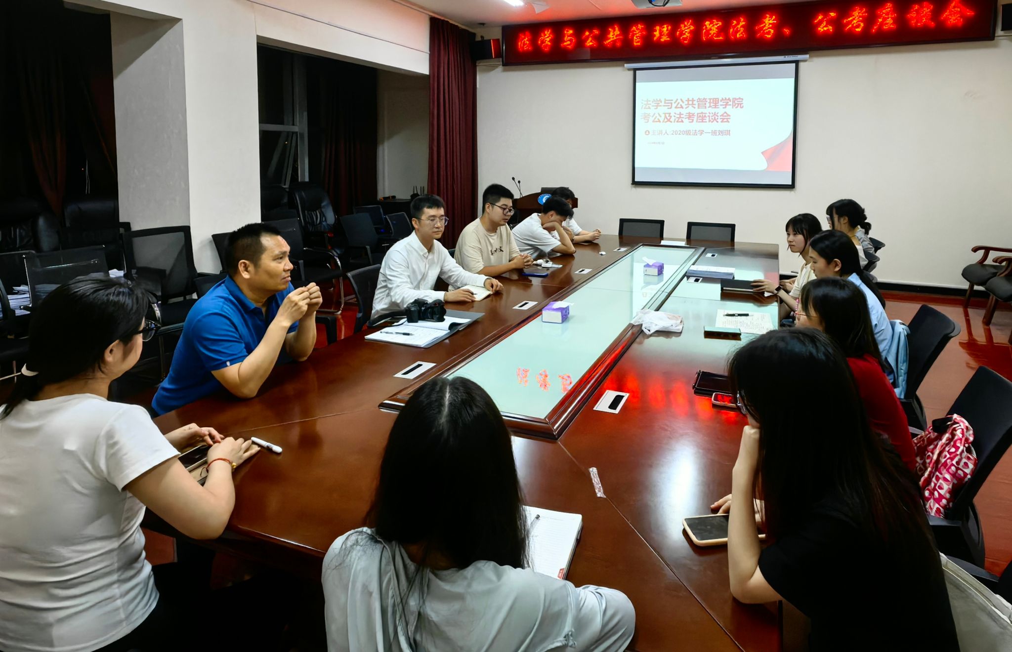 (本网讯)为扎实做好2025年公考、法考和就业指导工作。6月3日,法学与公共管理学院在414-2会议室举办法考及考公座谈会。会议邀请2020级优秀学生代表刘琪担任主讲嘉宾。学院党委副书记李茂华、辅导员张伊昌莅临指导,2021级法学专业学生代表近20人参与座谈会。