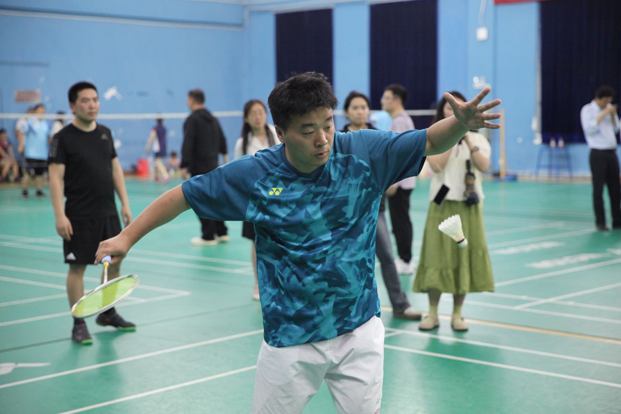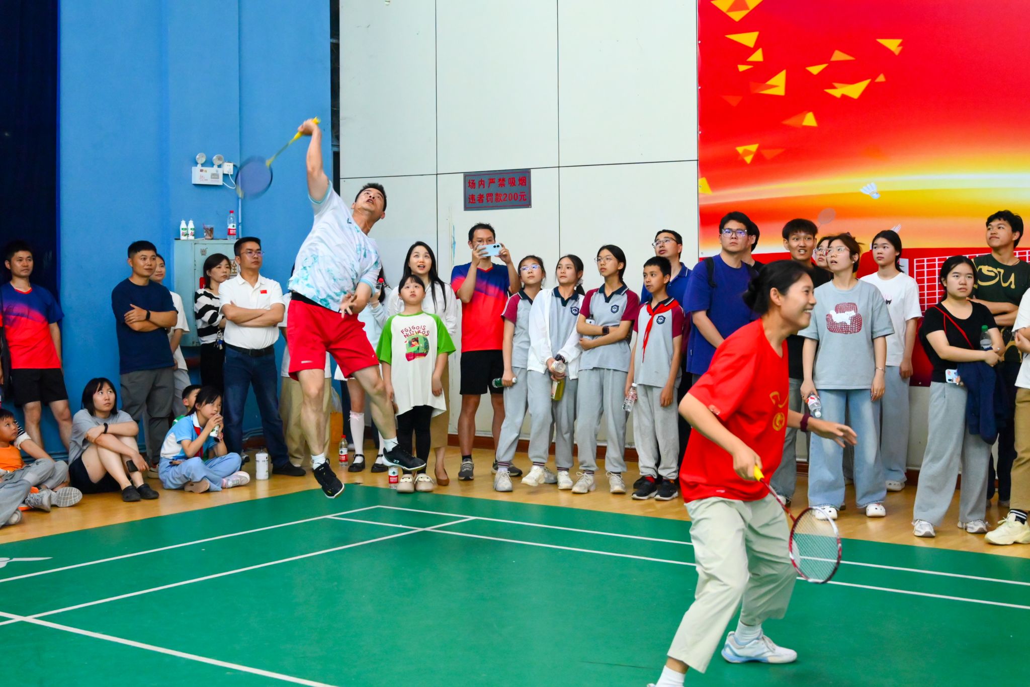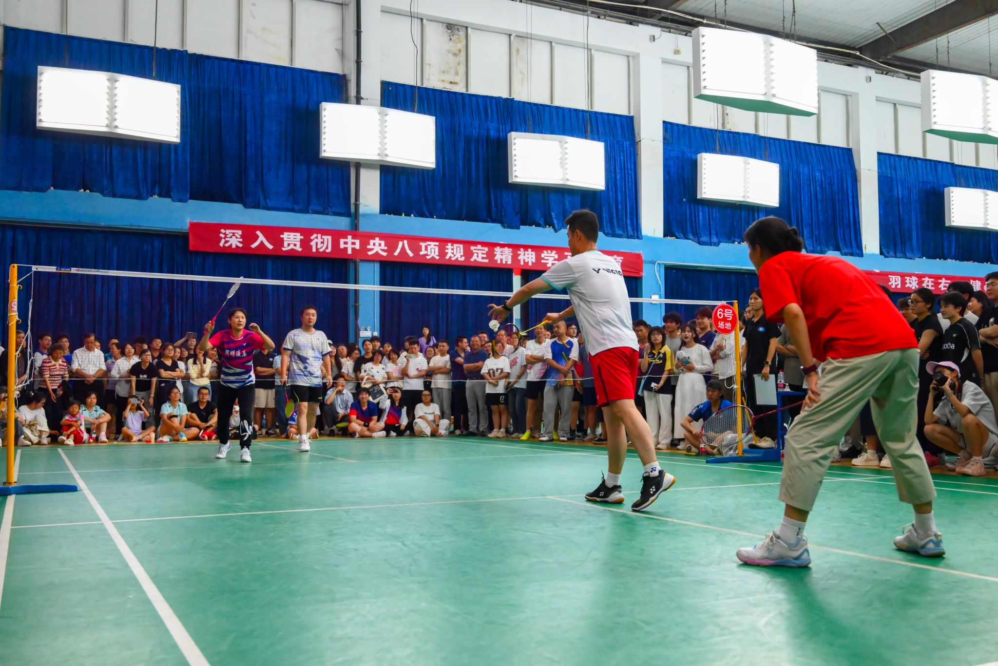 在总决赛的激情余韵中,校工会精心打造的“冠军表演赛”压轴登场。体育学院教师、羽毛球世界冠军张稳、骆羽、熊俊、骆赢联袂献上了一场精彩绝伦的羽坛盛宴。冠军们配合默契,眼神如炬,步伐灵动。他们时而侧身蓄力,时而手腕轻抖,每一次战术的巧妙变换,每一回合技术的巅峰博弈,都让现场观众大饱眼福,喝彩声、欢呼声回荡全场。