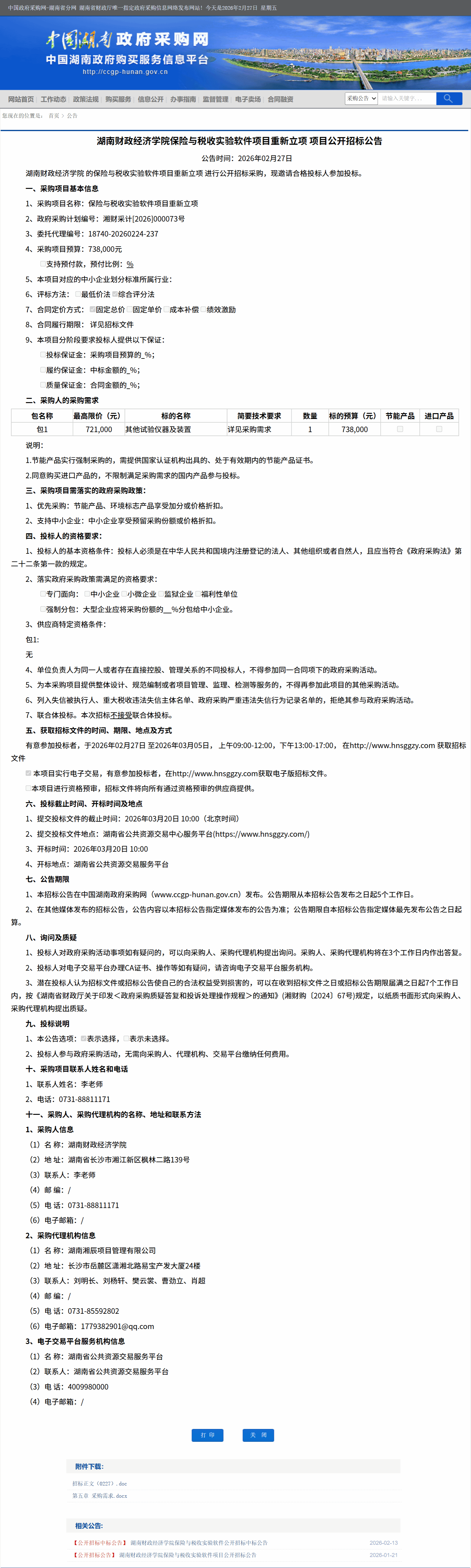 湖南省政府采购网:2026世界杯官方合作网站保险与税收实验软件项目重新立项项目公开招标公告