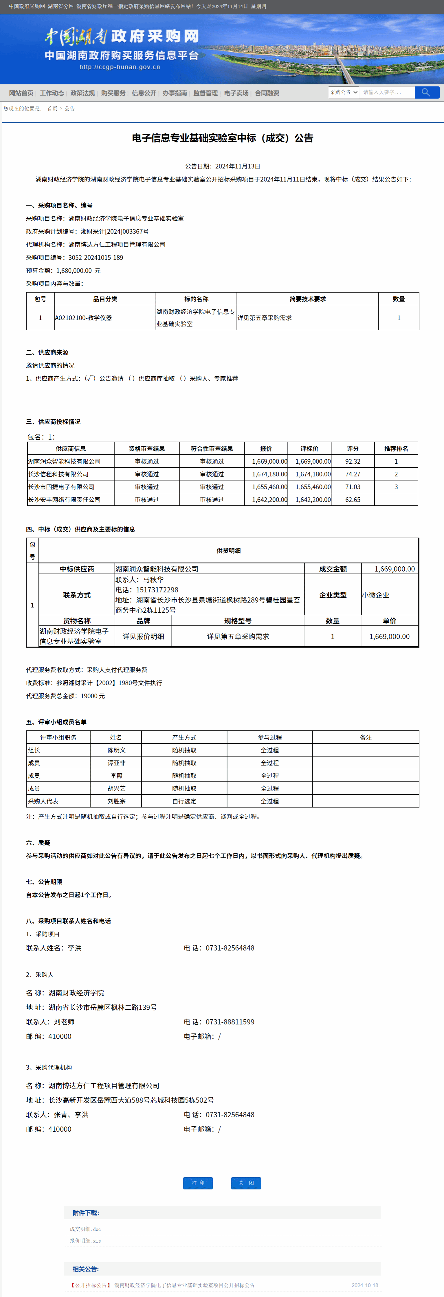 湖南省政府采购网:2026世界杯官方合作网站电子信息专业基础实验室中标(成交)公告