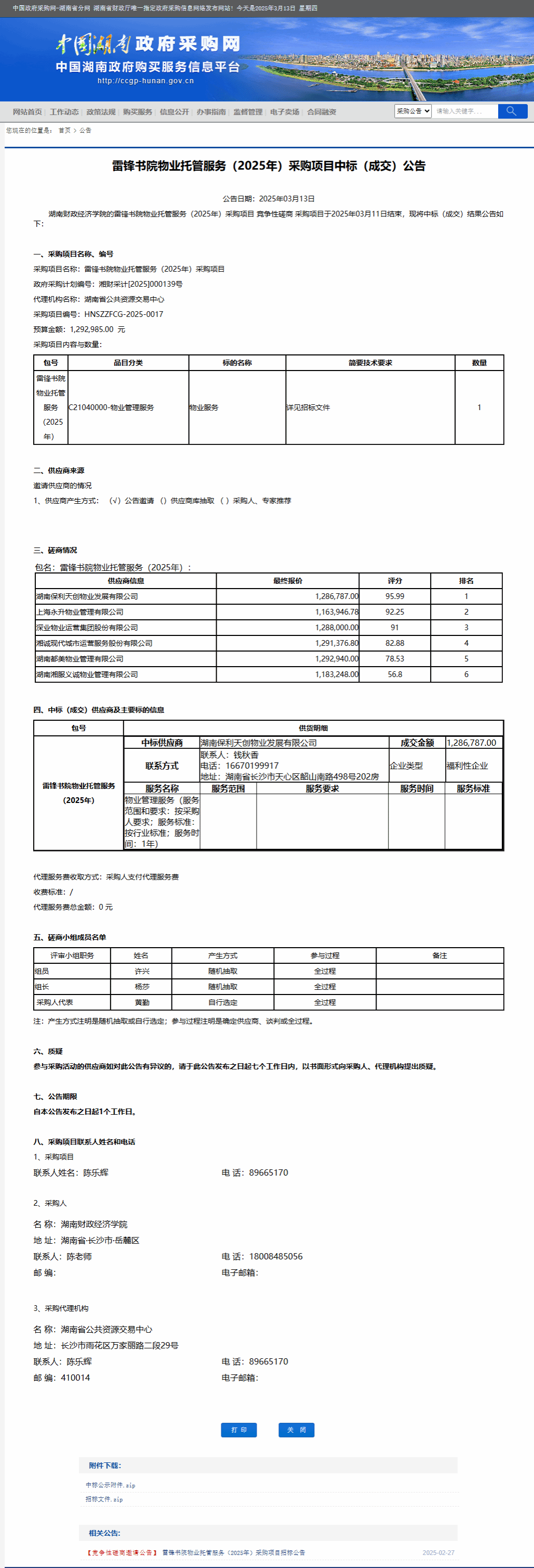 湖南省政府采购网:2026世界杯官方合作网站雷锋书院物业托管服务(2025年)采购项目中标(成交)公告