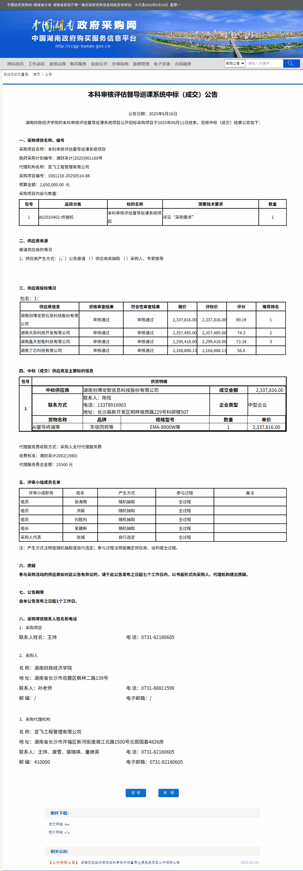 湖南省政府采购网:本科审核评估督导巡课系统中标(成交)公告