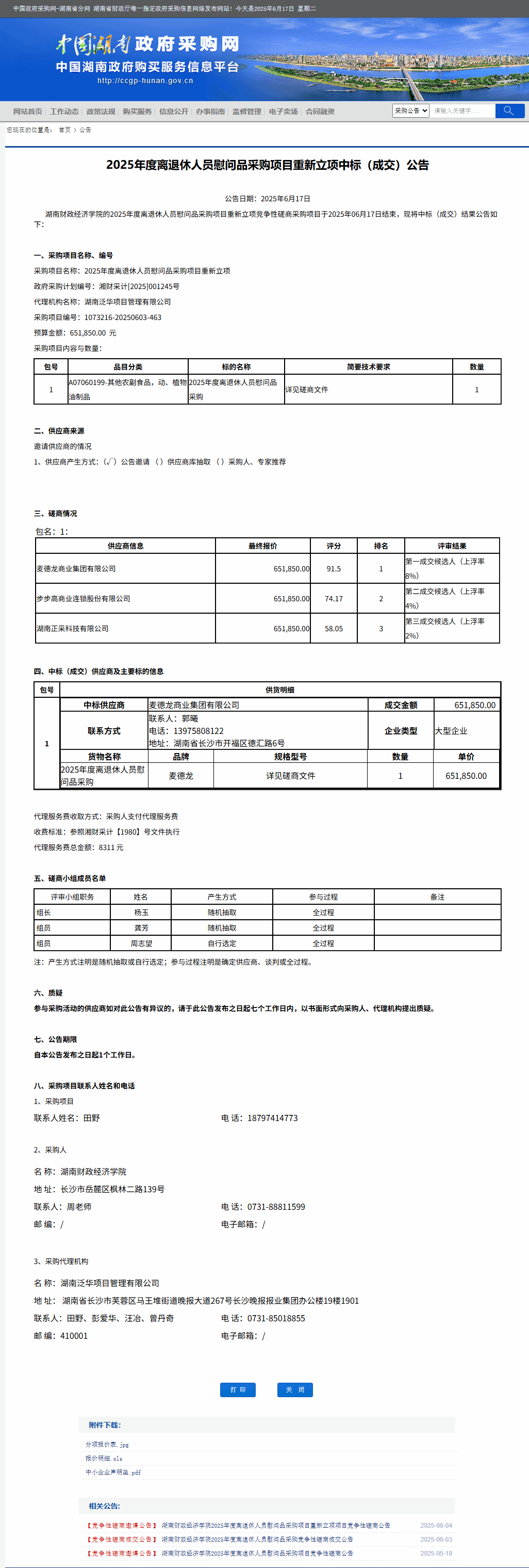 湖南省政府采购网:2026世界杯官方合作网站2025年度离退休人员慰问品采购项目重新立项中标(成交)公告
