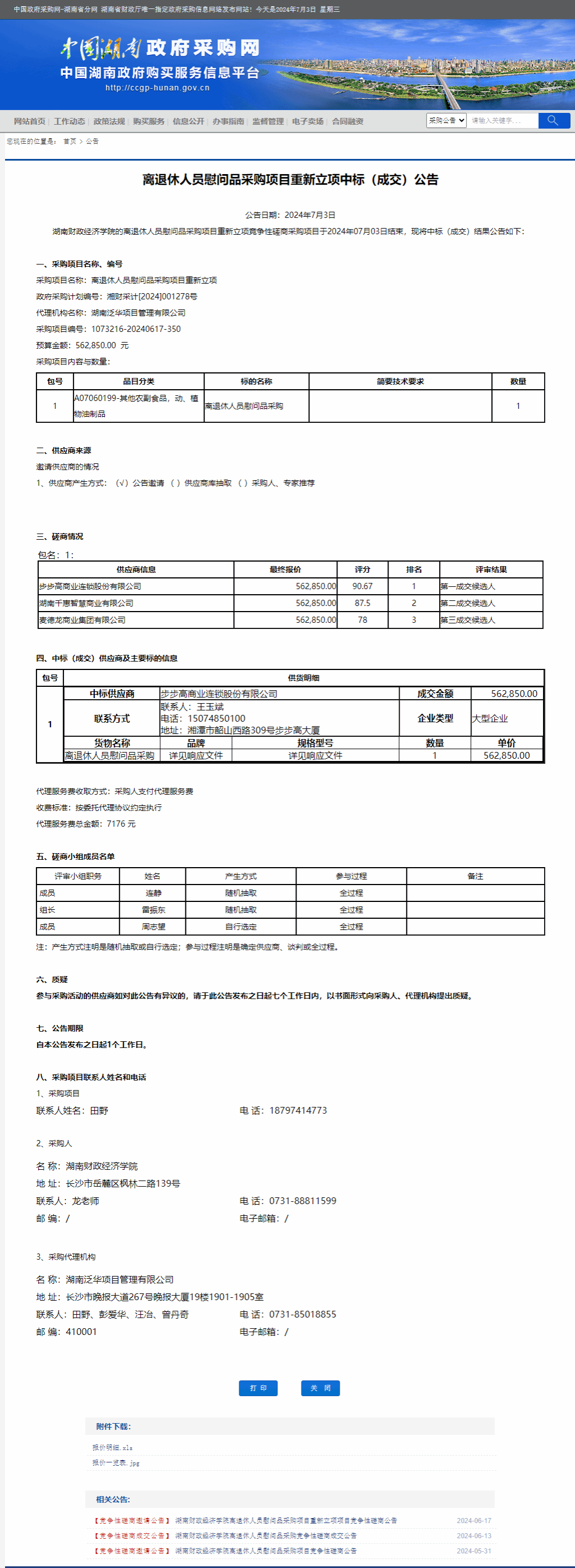 湖南省政府采购网:离退休人员慰问品采购项目重新立项中标(成交)公告