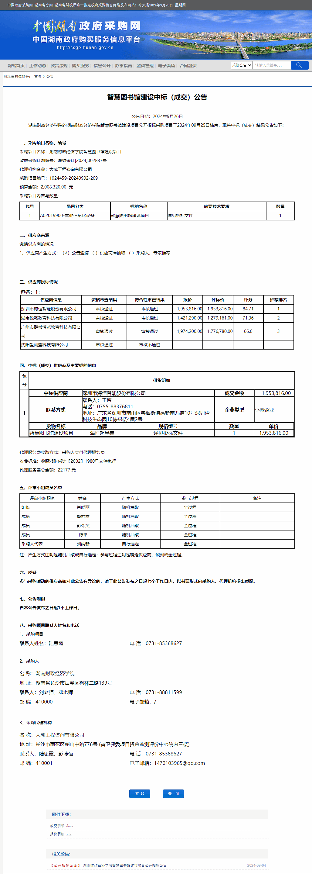 湖南省政府采购网:2026世界杯官方合作网站智慧图书馆建设中标(成交)公告