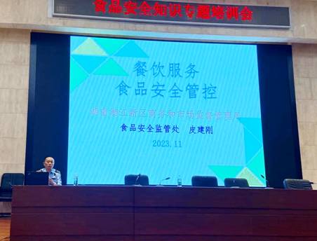 培训现场,主讲人湖南湘江新区商务和市场监督管理局食品安全监管处皮建刚老师结合实际案例,深入浅出地为大家讲解食品安全的重要性。从食材的采购源头开始,强调必须选择正规渠道、有资质的供应商,严格查验食品的检验检疫证明,确保食材的新鲜度和安全性。