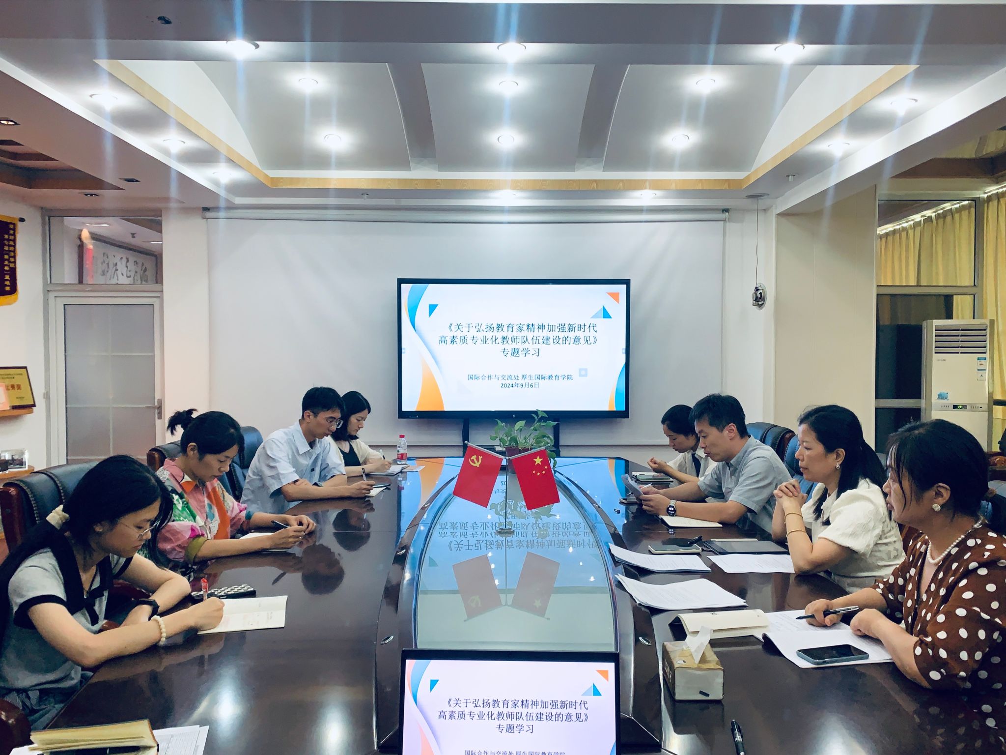 9月5日下午,国际合作与交流处、厚生国际教育学院在办公楼830会议室召开新学期全体教职工大会。会议由直属支部书记肖平飞主持,部门及学院全体教职工参加会议。