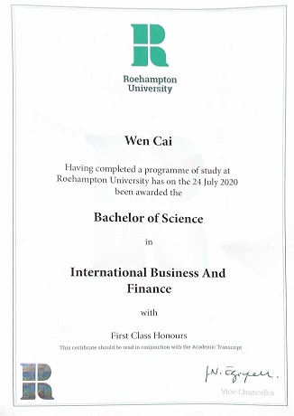 BSc(Hons) International Business and Finance国际商务与金融专业荣誉理学学士学位证书(第四年赴英国学习并完成学业者)