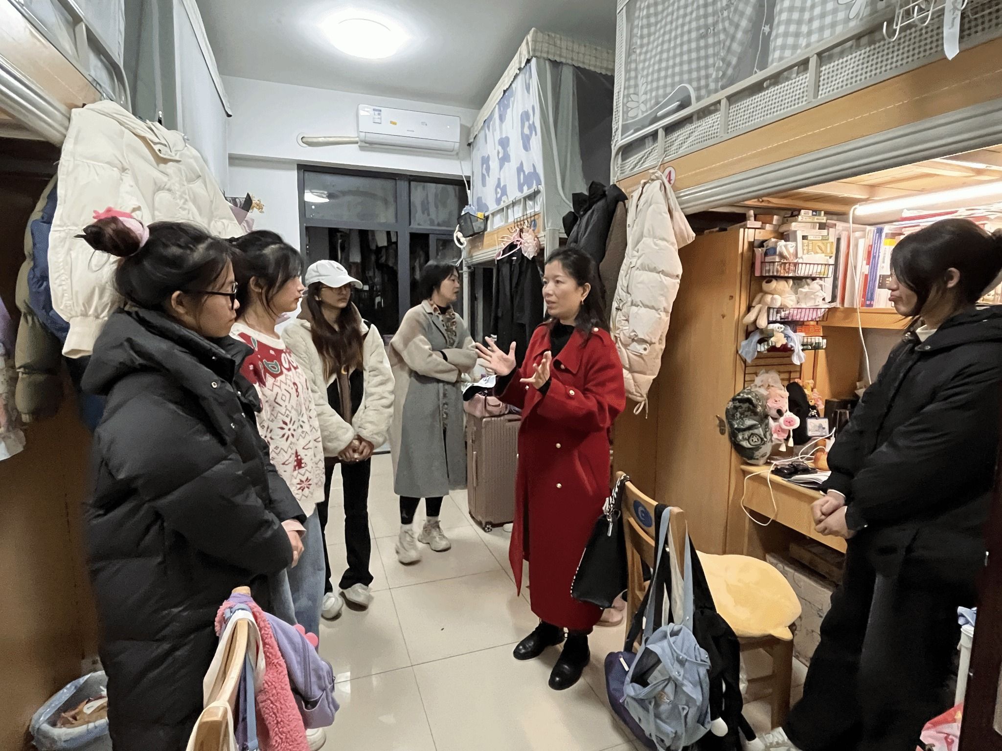为提高学生管理工作的实效,了解学生的思想、学习、生活以及心理状况,消除安全隐患,推进平安校园建设,营造安全、文明、整洁的住宿环境,12月14日晚,厚生国际教育学院直属党支部书记肖平飞、国际合作与交流处副处长傅佳带领综合办主任马艳以及学生专职辅导员深入学生寝室走访。