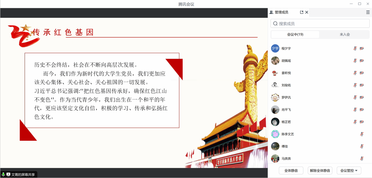 肖平飞领学 微党课环节,学生党员文菁、杨芷若、杨璇分别以"争做时代传承人"、“学习伟人思想贯彻全会精神、争当改革先锋”、“从奥运精神中汲取奋进力量—争做改革先锋”为主题分享了学习心得。