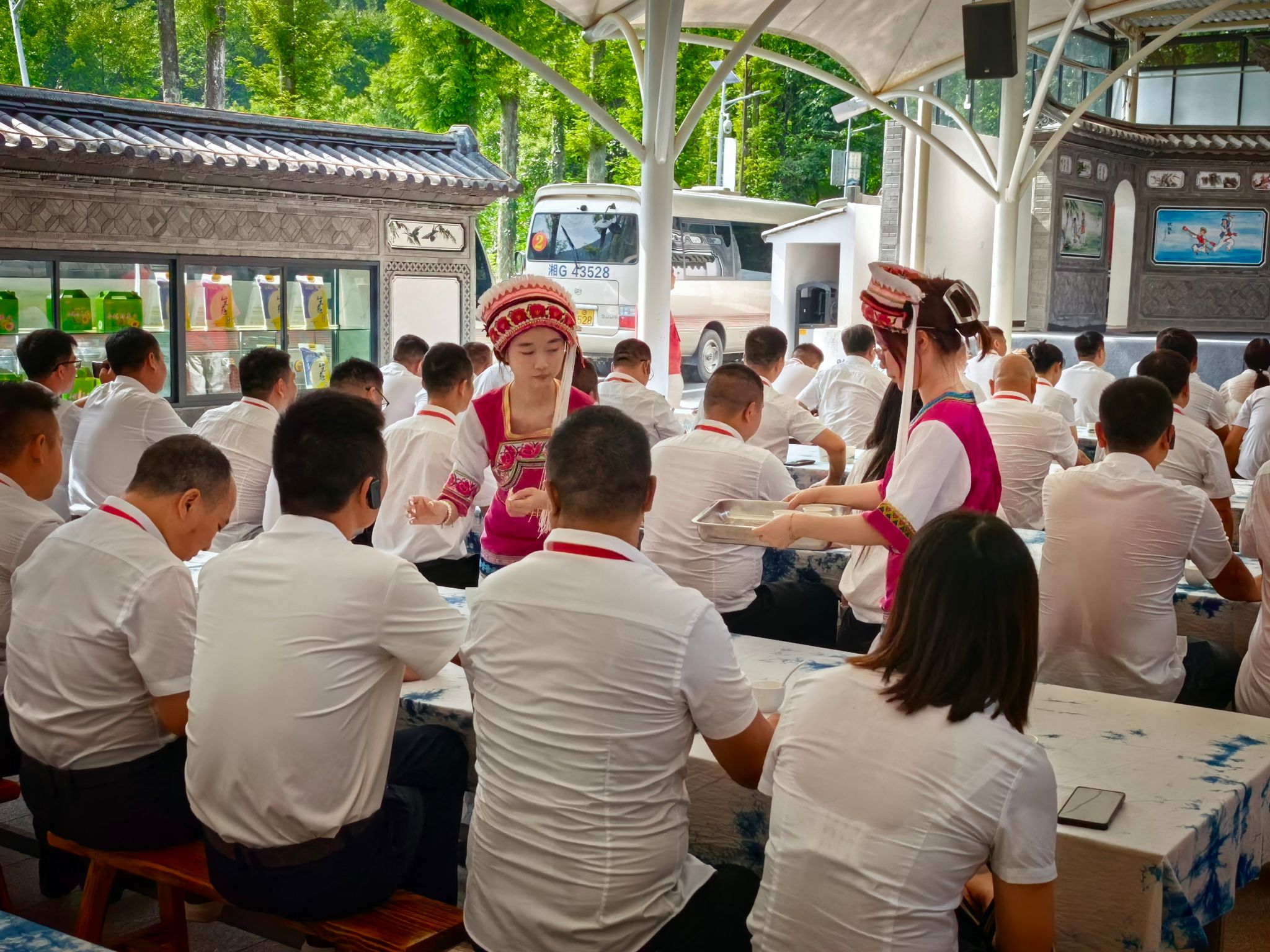 实践队队员在给来参观的各地村支书上白族“三道茶”