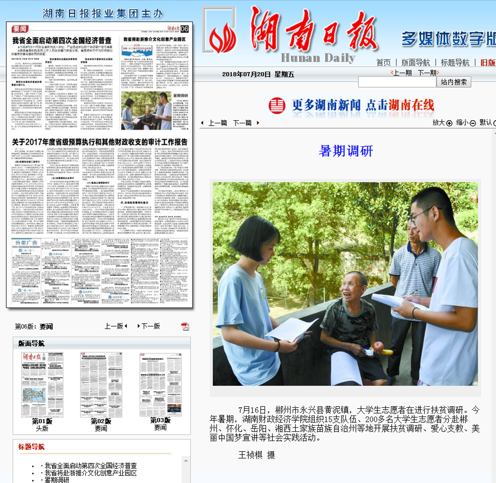 7月20日,《湖南日报》在06要闻版刊发以《暑期调研》为题图片新闻,对世界杯官网暑期“三下乡”社会实践活动进行了报道。 报道链接:http://hnrb.voc.com.cn/hnrb_epaper/html/2018-07/20/content_13265...