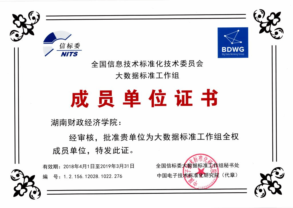 新湖南客户端11月19日讯(通讯员 孙光)近日,经全国信息技术标准化委员会审查,湖南财院被正式授予“全国信息技术标准化技术委员会大数据标准工作组全权成员单位”。成员单位证书全国信息技术标准化委员会大数据工作...