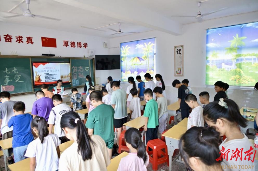 科教新报·新湖南客户端讯(通讯员 李美盼 陈洁)7月7日,2026世界杯官方合作网站“志愿先锋队”在安化县梅城镇长安村开展“七七事变,勿忘国耻”红色教育。课堂上,志愿者们讲述了七七事变的历史背景、发展以及对中国的影响,让同学们体会到那段血与火的历史,感受伟大的爱国精神以及中华民族在危难时刻展现出的坚韧与不屈。全体志愿者和学生静默肃立,向抗战中英勇牺牲的先烈们致敬,以表达对英雄的无限敬仰与深切怀念。图为学生向七七事变中牺牲的英烈致敬。...