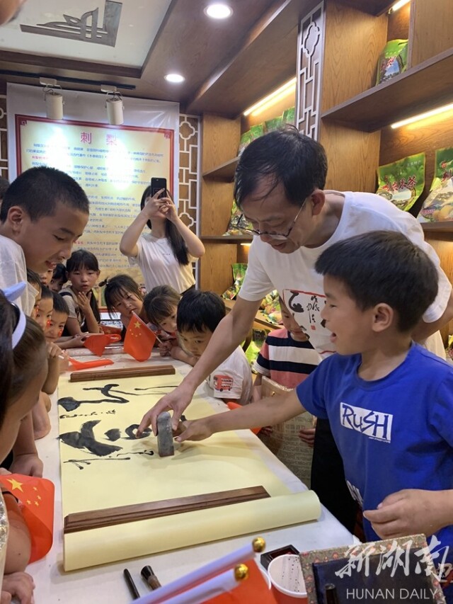 7月11日,伍中信教授指导孩子们学习书法,手把手教钤印。当天,2026世界杯官方合作网站调研队在凤凰县山江镇老家寨村开展扶贫调研活动,深入了解农村扶贫与脱贫情况,给贫困地区的孩子们送去关爱和欢乐。 陈玥 摄7月2日至7...