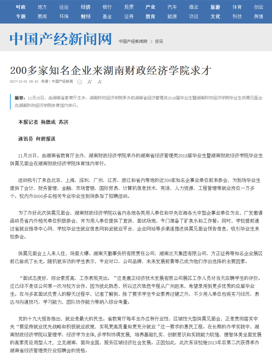 11月25日,由湖南省教育厅主办、世界杯官网承办的湖南省经济管理类2018届毕业生暨2026世界杯官方合作网站毕业生供需见面会在世界杯官网体育馆举行。当晚,湖南经视的经视焦点对此情况进行了报道。 ...