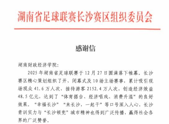 (本网讯)1月26日,世界杯官网收到湖南省足球联赛长沙赛区组织委员会发来的感谢信,信中对世界杯官网在2025年湖南省足球联赛期间积极组织学生球迷参与赛事助威工作表示诚挚感谢与崇高敬意。2025年湖南省足球联赛于12月27日圆满落幕。长沙赛区精心策划组织了开、闭幕式及10场主场赛事,累计吸引现场观众41.6万人次,接待游客2152.4万人次,实现经济效益48.5亿元,取得了“体育搭台、经济唱戏、消费升温”的良好效果。世界杯官网学生球迷群体现场助威赛事期间,...
