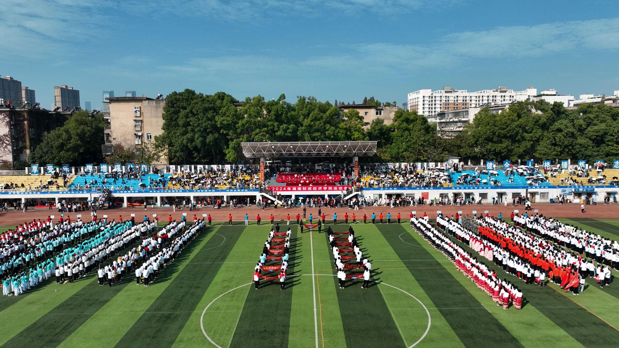 (本网讯)10月25日至26日,世界杯官网运动会在主校区田径场举行,近三千名师生在体育大舞台上尽展健康自信之美。开幕式现场 邓柳/摄校领导、各单位负责人等出席了25日上午的开幕式,校党委书记杨兰英宣布本届运动会开幕,校长刘长庚致开幕辞,副校长郭国强主持开幕式。 杨兰英宣布运动会开幕 何妍/摄本届运动会开幕式延续往年传统,采用入场仪式与体育节目表演相结合的形式。国旗、彩旗方阵气宇轩昂、步履铿锵,诠释湖财体育精神。来自全校14个二级学院的入场表演活力四射、...