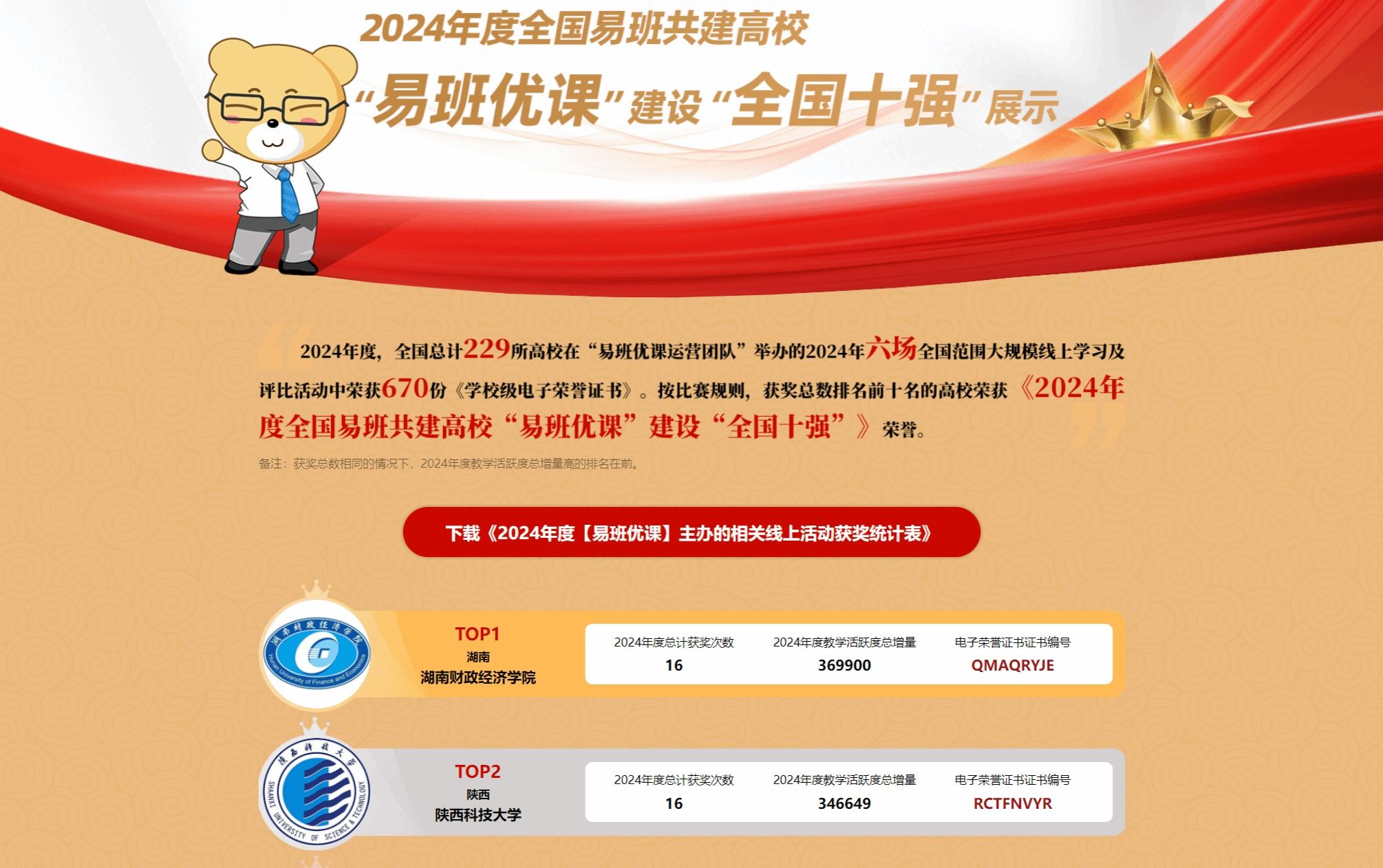 (本网讯)近日,2024年度全国易班共建高校“易班优课”建设评选结果公布,世界杯官网荣获2024年度全国易班共建高校“易班优课”建设“全国十强”荣誉。这是世界杯官网继2021年以来,第三次获得此项殊荣。2024年,学校借助“易班优课”平台开设了33个优课课程,获得2024年1-10月全国易班优课月度优秀十佳案例、2024年第一届易班优课求职辅导课程学习大赛优秀组织奖、2024年易班网第四届全国大学生简历设计大赛优秀组织奖、2024年易班优课高校美食文化图文课大赛优秀组织奖、...