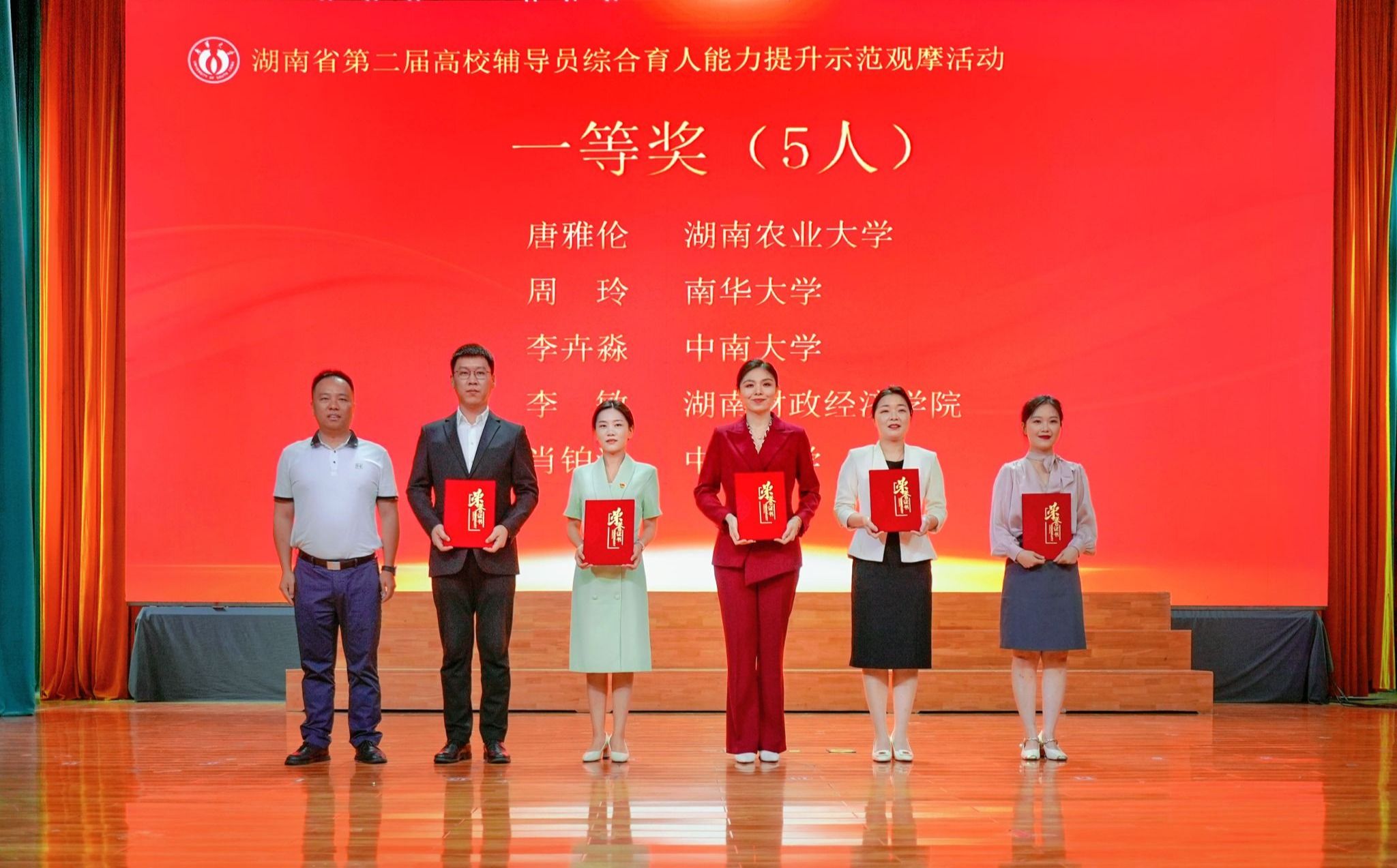 (本网讯)5月23日,湖南省第二届高校辅导员综合育人能力提升示范观摩活动在南华大学圆满落幕。世界杯官网会计学院辅导员李敏凭借扎实的专业功底和出色的现场表现,从全省129所高校优秀辅导员中脱颖而出,一举夺得一等奖,实现了世界杯官网在该项赛事中的历史性突破。李敏(左三)代表学校上台领奖本次活动由湖南省委教育工委、湖南省教育厅联合主办,南华大学承办,设置理论测试、描述定位、案例研讨、谈心谈话四个竞赛环节,重点考察辅导员的理论功底、...