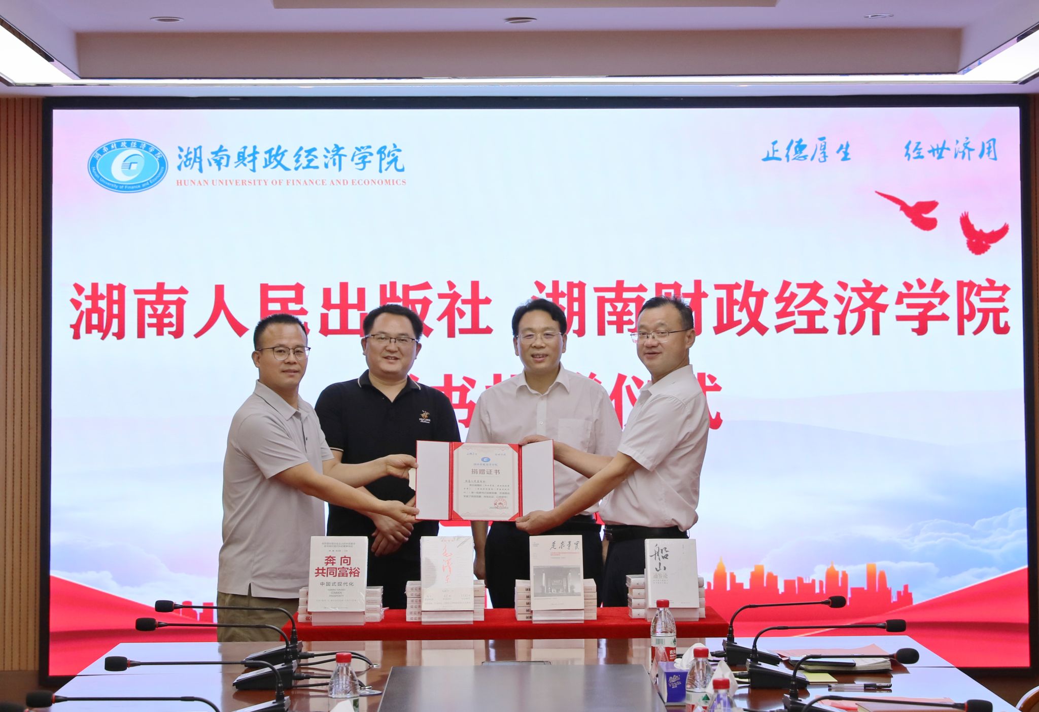 (本网讯)7月14日下午,湖南人民出版社捐赠图书仪式在世界杯官网办公楼715会议室举行。湖南人民出版社党委书记、社长张勤繁,副社长彭翔,校党委书记易棉阳,副校长潘爱民,党委委员、宣传部、统战部部长文炳勋出席捐赠仪式。仪式现场易棉阳对张勤繁一行表示热烈欢迎,对湖南人民出版社的图书捐赠致以诚挚感谢,并介绍了学校的发展历程。他表示,出版社作为文化产业的重要力量,学校作为文化传承的主阵地,在文化领域具有天然的协同关系。...