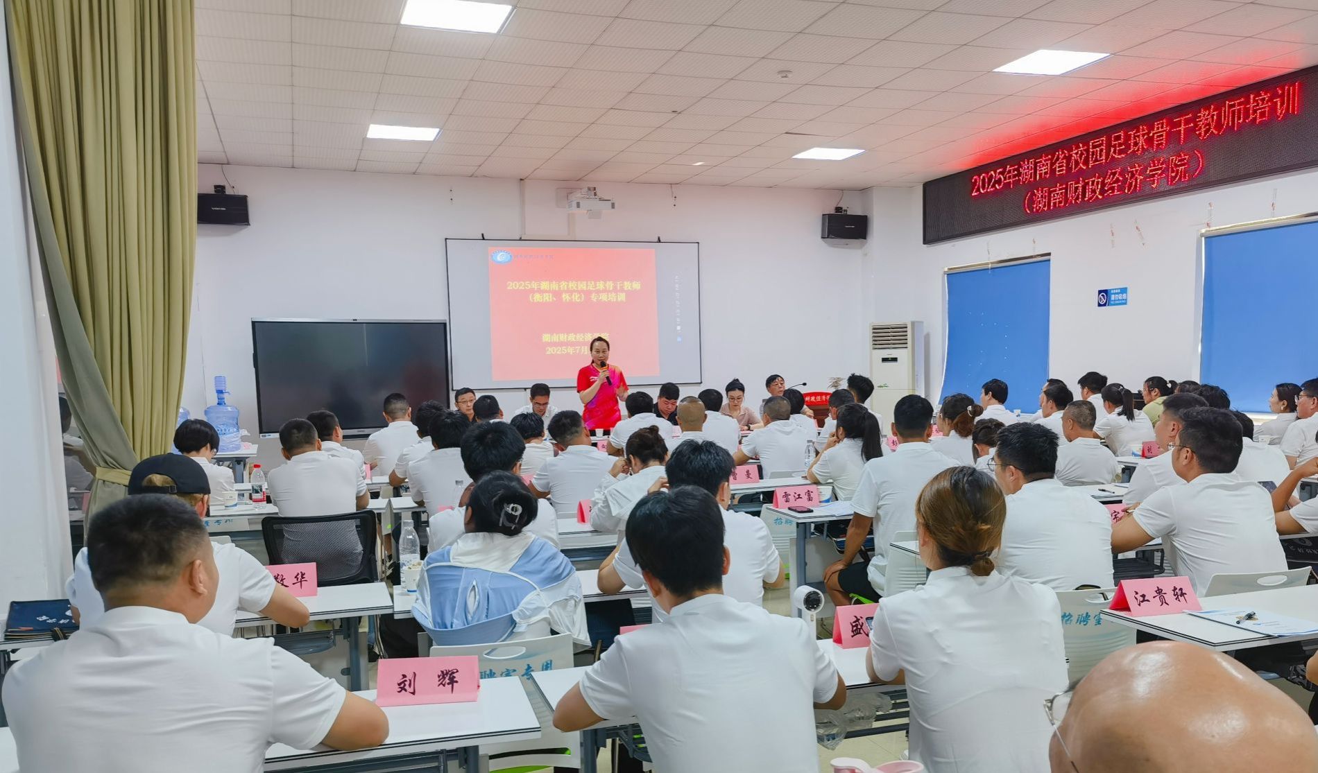 (本网讯)7月25日,2025年全省校园足球专项培训班开班仪式在世界杯官网举行。湖南省教育厅体育卫生与艺术教育处主任张志敏、湖南省校园足球办办公室主任李泽群,世界杯官网党委副书记苏玲以及体育学院、党政办相关负责人出席开班仪式。开班仪式现场苏玲代表学校向参训学员表示热烈欢迎,并详细介绍了学校的体育工作特色及相关育人经验。她指出,校园足球既是落实立德树人任务的关键抓手,更是促进学生全面发展的重要平台。学校将全力保障本次培训顺利开展,...