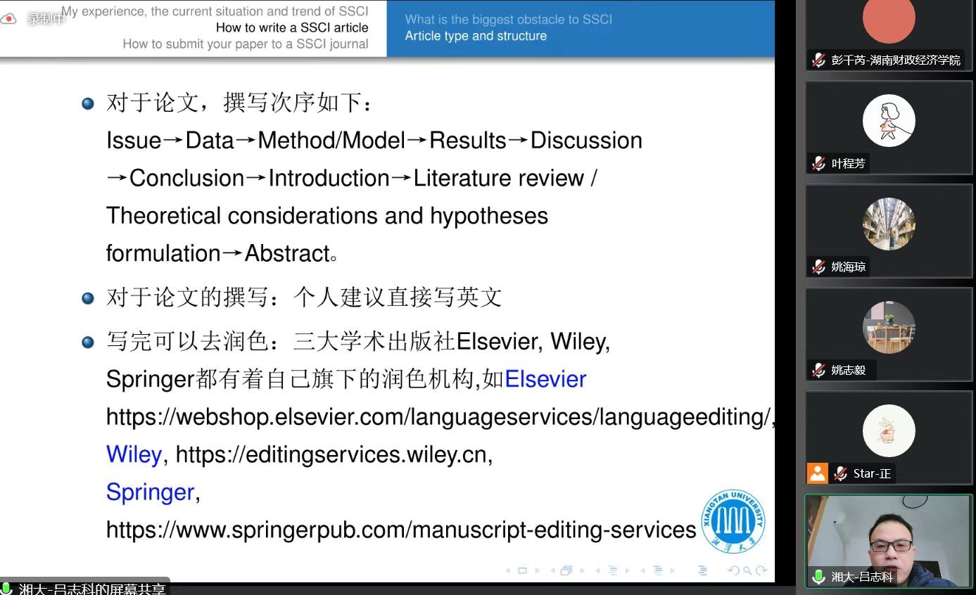 (本网讯)12月17日下午,经济学院邀请湘潭大学商学院吕志科教授作题为“SSCI论文写作、投稿和发表经验”的学术讲座。受疫情影响,讲座以线上直播的方式进行。经济学院副院长彭千芮主持讲座,经济学院副院长陈雯、各...