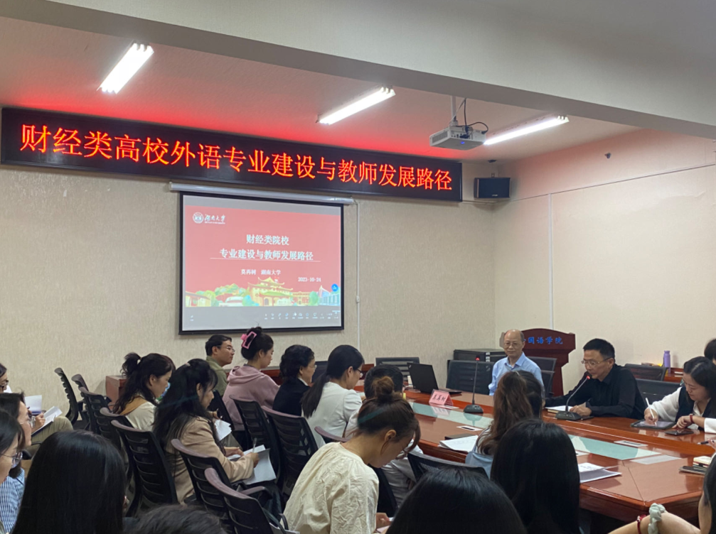 (本网讯)10月24日下午,应外国语学院邀请,湖南大学外国语学院院长莫再树教授来世界杯官网作“财经类高校外语专业建设与教师发展路径”专题讲座。讲座由外国语学院党委书记蒋勇威主持,该院50余名专任教师到场聆听。讲座现场莫再树分享了部分高校外语学科建设、专业建设、课程建设的成功经验,并就高校外语专业建设谈了自己的看法。他指出,在新文科视域下,外语学科被赋予了新使命和新任务,外语人必须明确外语学科变革的必然趋势,紧随新形势,...