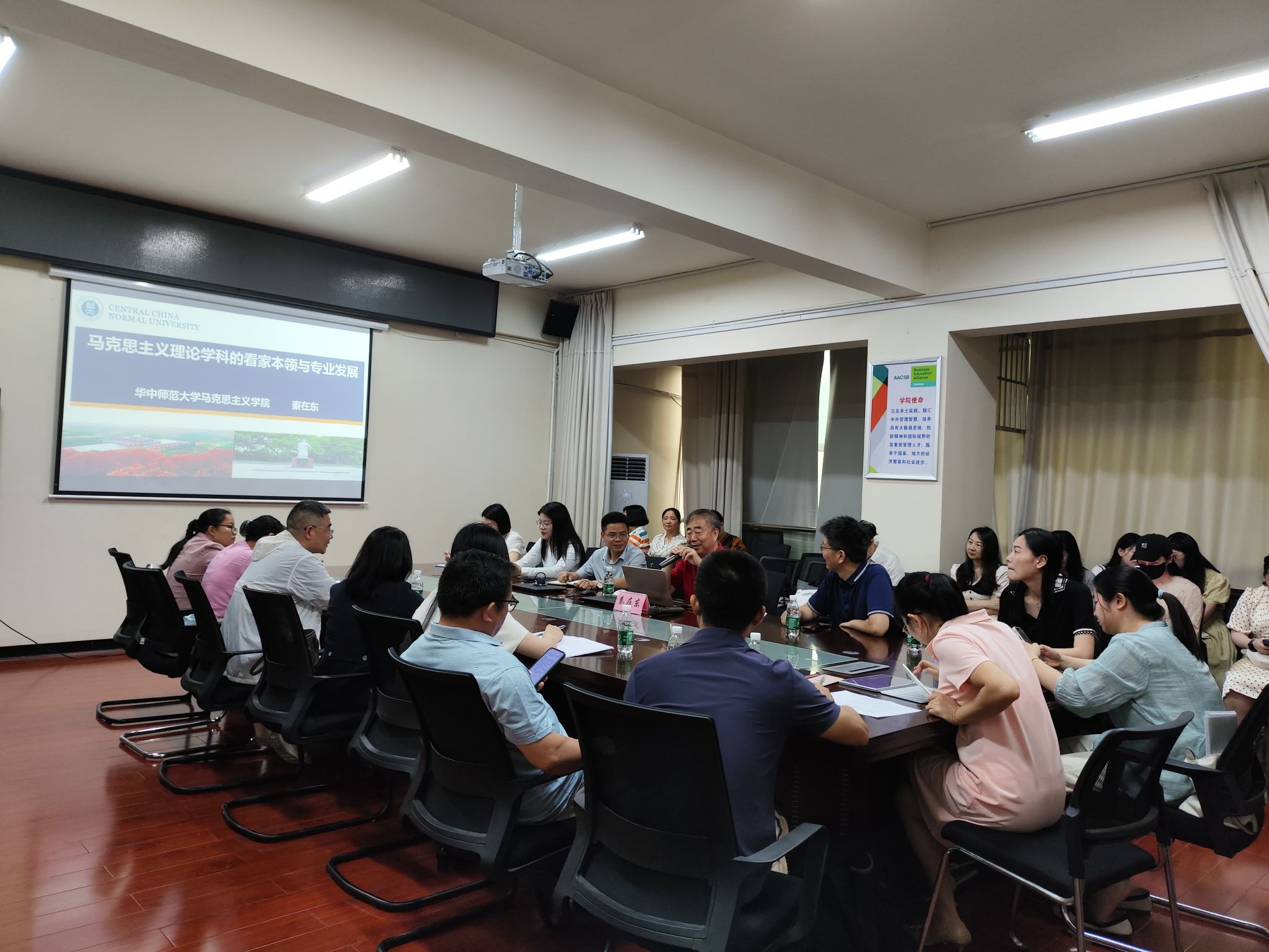 (本网讯)6月17日上午,马克思主义学院邀请教育部高等学校马克思主义理论类教学指导委员会委员、思想政治教育管理学科首倡者和领军人、华中师范大学秦在东教授来校作“马克思主义理论学科的看家本领与专业发展”专题讲座。院长黄建跃主持讲座,全体教师参加。讲座现场秦在东在讲学中秦在东介绍了马克思主义理论学科的“前世今生”,总结了马克思主义理论学科的“看家本领”,分析了马克思主义理论学科的“专业发展”。他指出,思政课教师要有“...