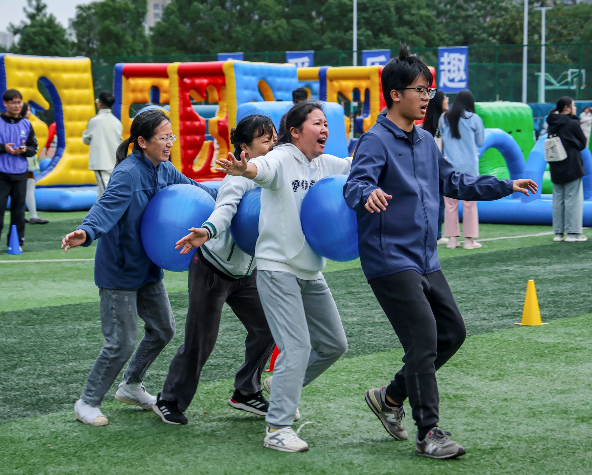 此次运动会设置超级障碍赛、同心圆梦、趣味飞盘九宫格、趣味夹乒乓球四个项目,“趣”字当头,精彩纷呈。赛场上,老师们团结协作、挥洒汗水、较量体能,用拼搏点燃全场;场下,观赛老师们纷纷用热情的掌声、欢呼声为选手们加油鼓劲,紧张又刺激的角逐使得比赛充满激情和欢声笑语。