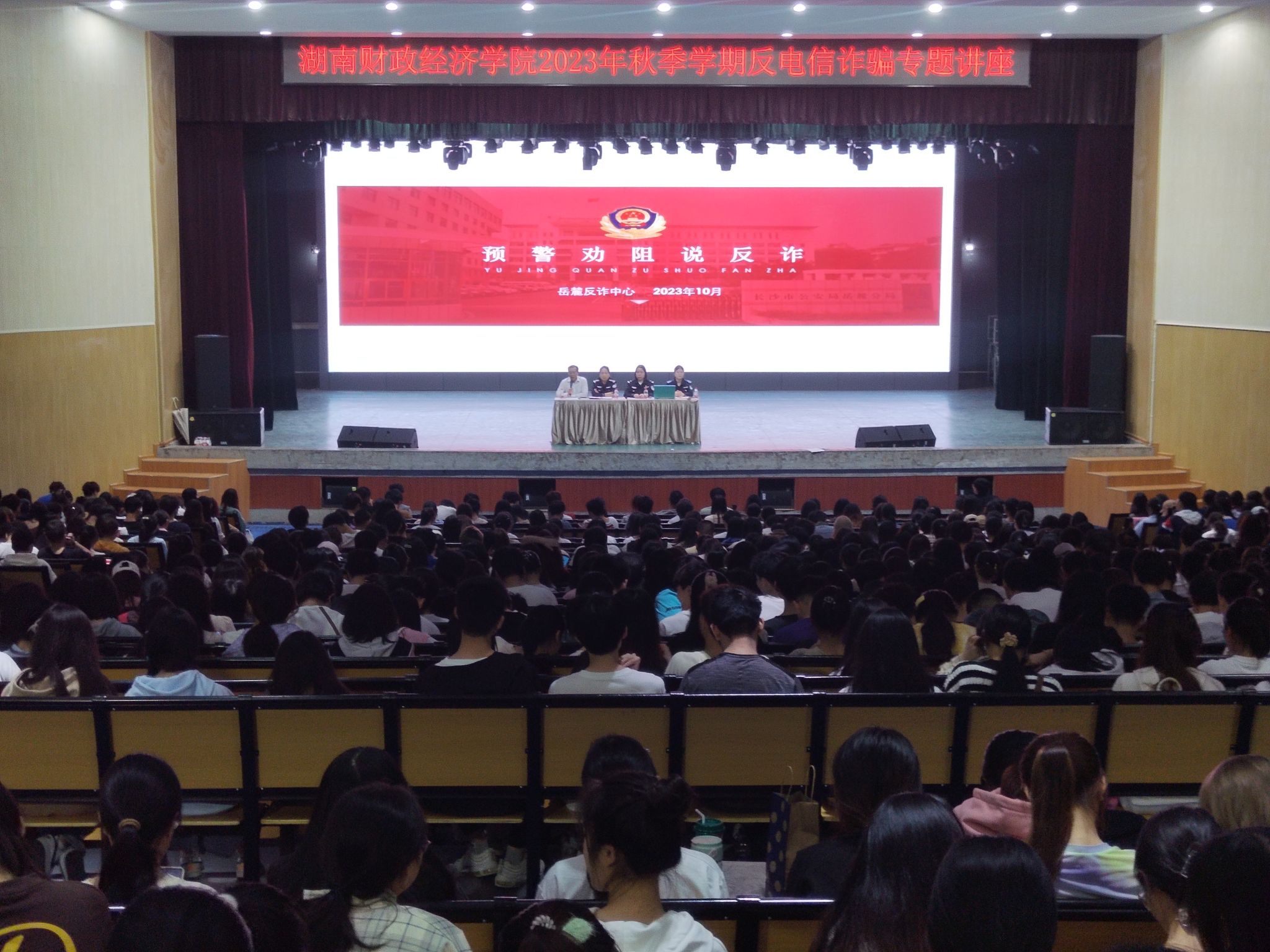 (本网讯)10月25日,学校在主校区大礼堂举办反电信诈骗知识专题讲座,邀请岳麓区公安分局刑侦大队副大队长、反诈中心主任唐贝,湘江新区协调办岳麓反诈中心宣讲员王紫威为学生传授反诈知识。讲座由保卫部部长郭志伟主持。
