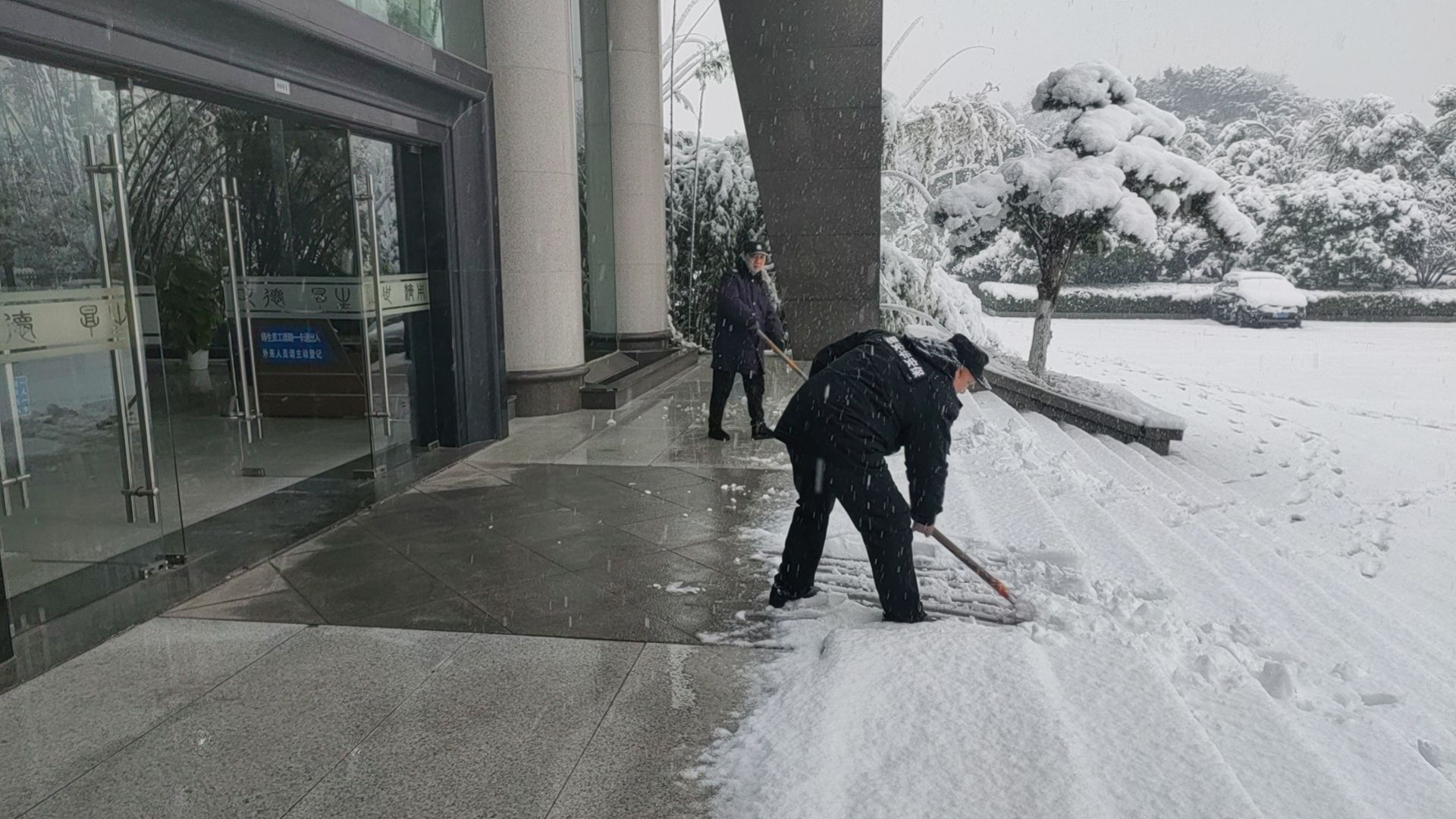 安保队员铲除办公楼门口积雪 尹湘东/摄