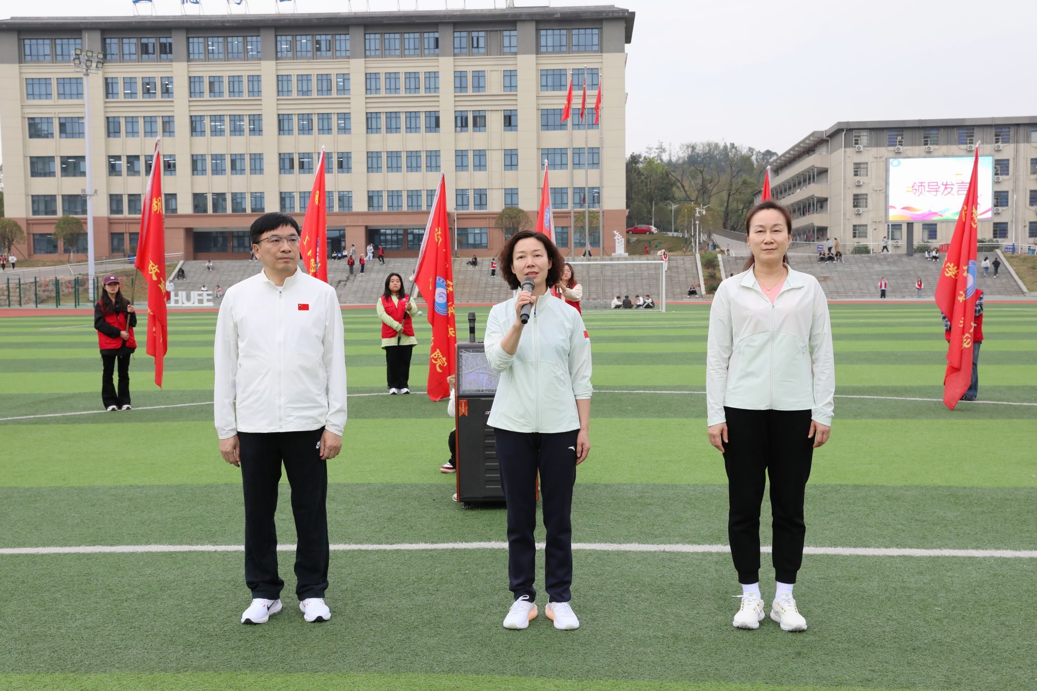 郭国强为校园百公里跑活动鸣枪发令。杨兰英、苏玲身穿运动装,跑在队伍前列,她们与师生代表围绕操场慢跑两圈。“正德厚生 经世济用”“健全人格 锤炼意志”的口号响彻田径场上空,每一声都饱含着湖财人始终与国家民族共命运、为建设体育强国贡献力量的家国深情与决心。