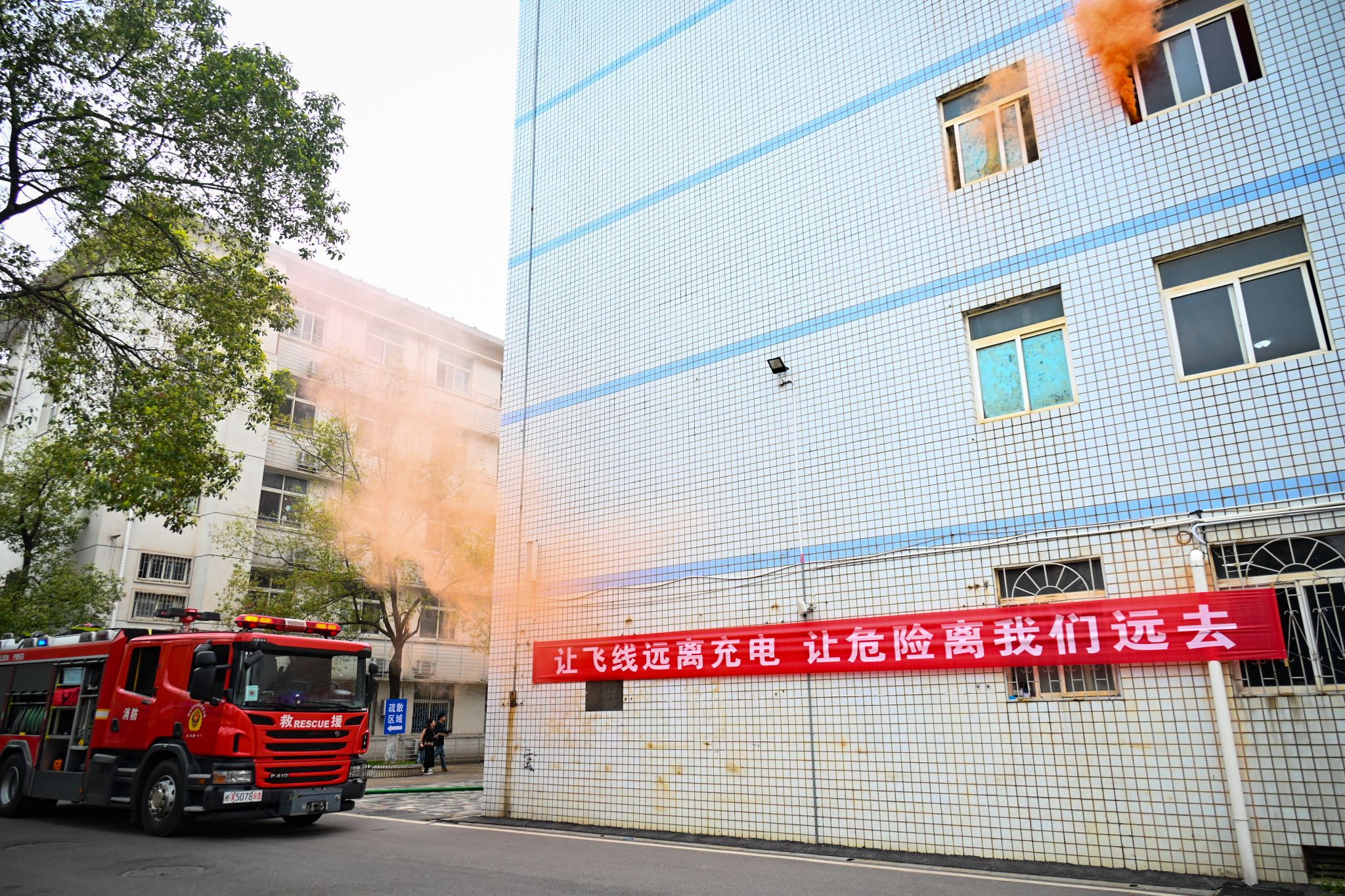 消防演练环节,模拟某楼学生宿舍栋发生火情,随着烟雾弹的浓烟升起,应急疏散和灭火救援演练正式开始,按照应急预案,参演队员有条不紊进行现场秩序维护、人员疏散、灭火等科目的演练,模拟场面逼真,疏散过程有序。