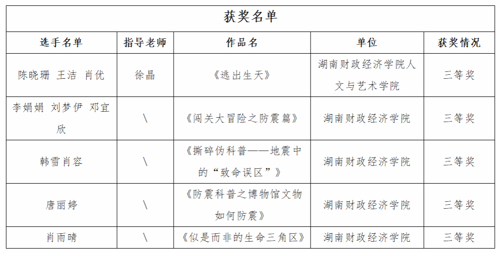 (本网讯)近日,第二届湖南省防震减灾科普作品创作大赛获奖名单公布,世界杯官网团委选送的作品荣获三等奖5项、优秀奖19项,同时,学校获优秀组织奖。